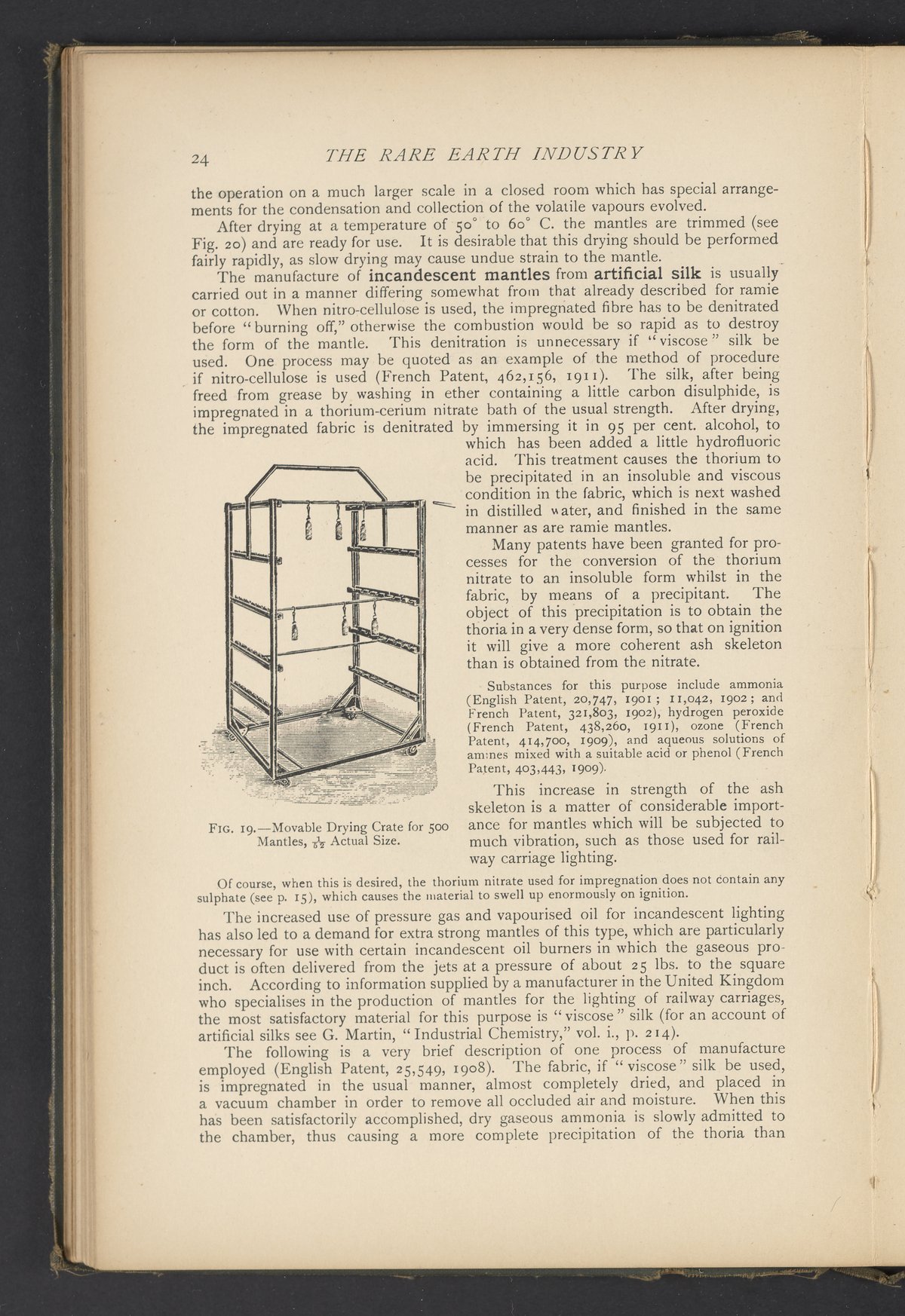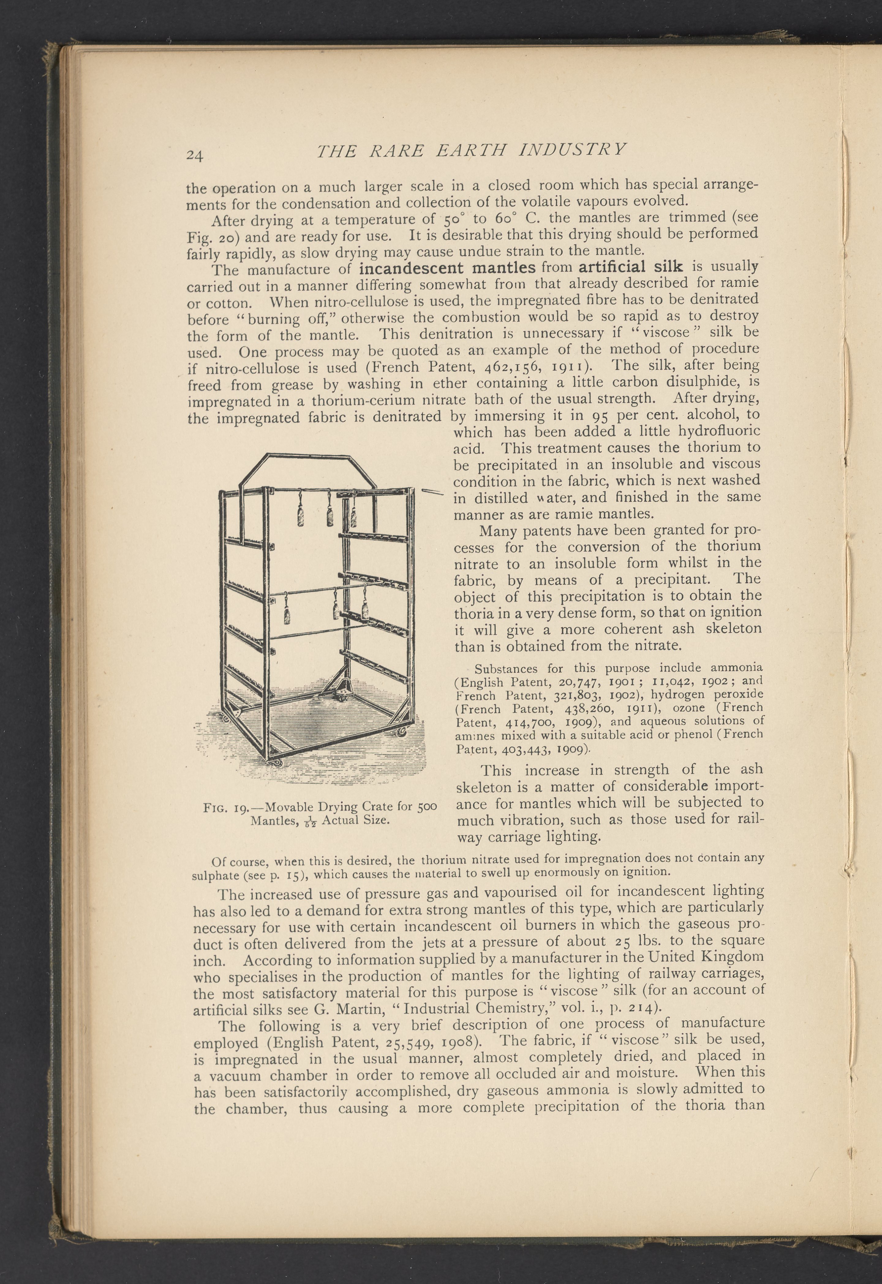 Figure 19 from the 1915 volume The Rare Earth Industry depicting a movable crate (1/52 actual size) for drying incandescent mantles, a component of incandescent gas lanterns. The volume details various industrial applications of rare earths and closely-related elements, including thorium, zirconium, tantalum, and tungsten. Particular attention is given to the illuminating effect of the oxides of thorium and cerium and their application to the manufacture of incandescent gas mantles and electric lamps. The volume also includes chapters on uranium and vanadium, as well as the industry of radioactive substances.