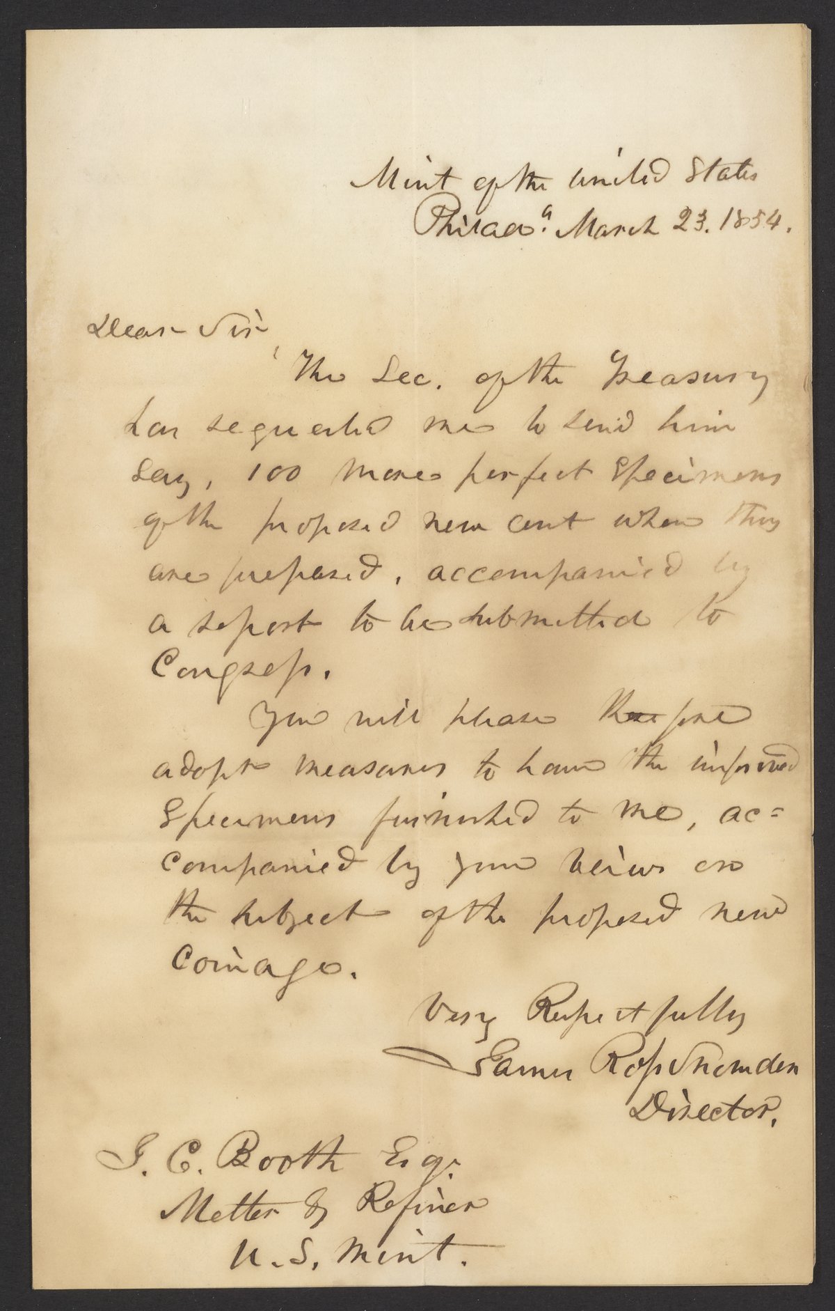 Small JPG1200 x 1882px — 263 KBFull-sized JPG2128 x 3337px — 725 KBOriginal fileTIFF — 2128 x 3337px — 20.4 MBJames Ross Snowden (1809-1878), who was treasurer of the U.S. Mint at the time, requests James Curtis Booth (1810-1888) to locate 100 perfect specimens of a proposed new cent piece and to write a report.