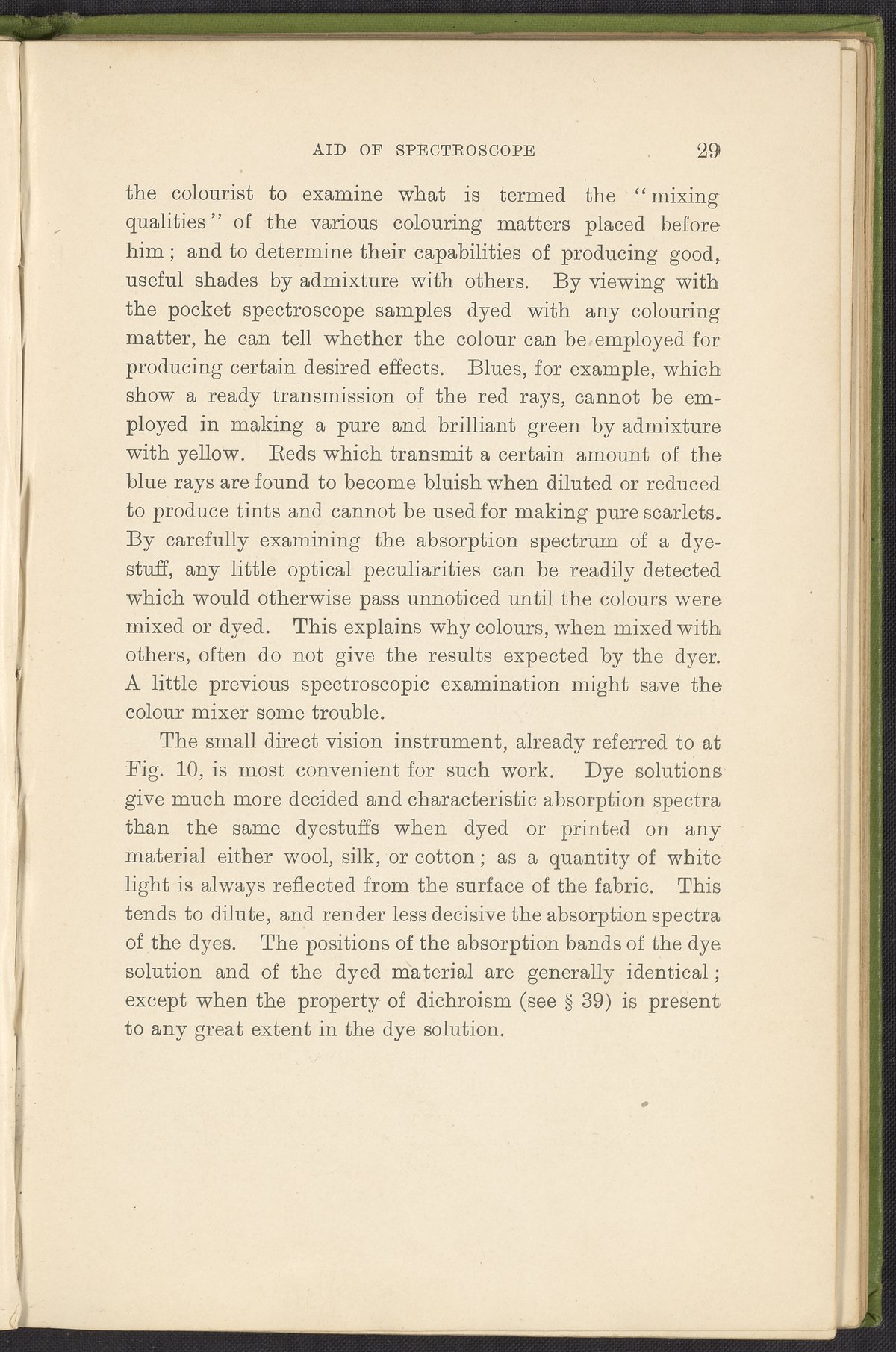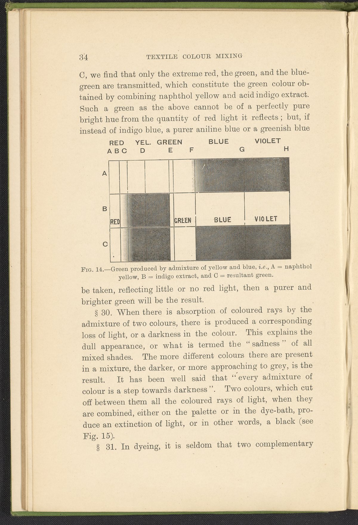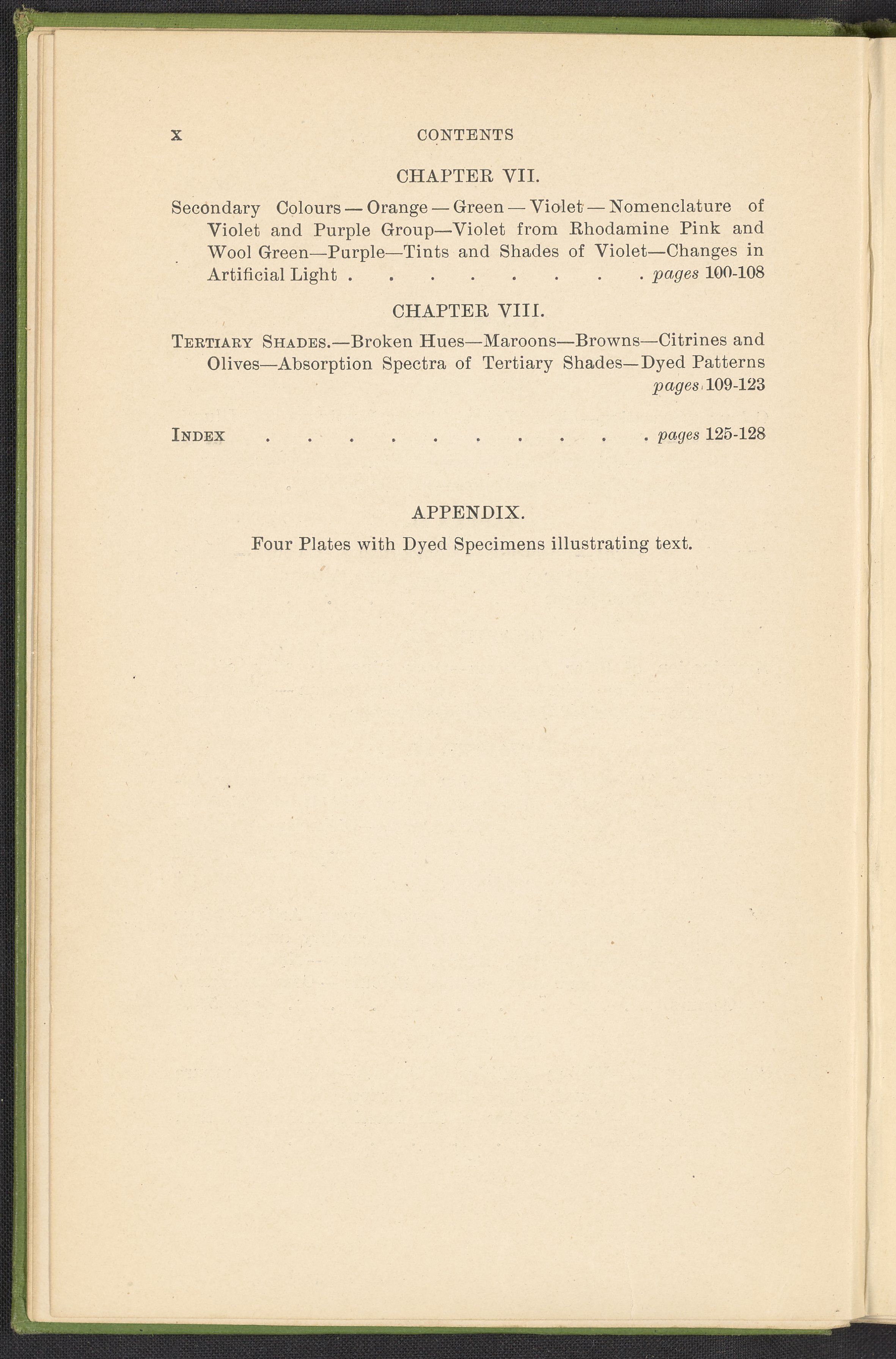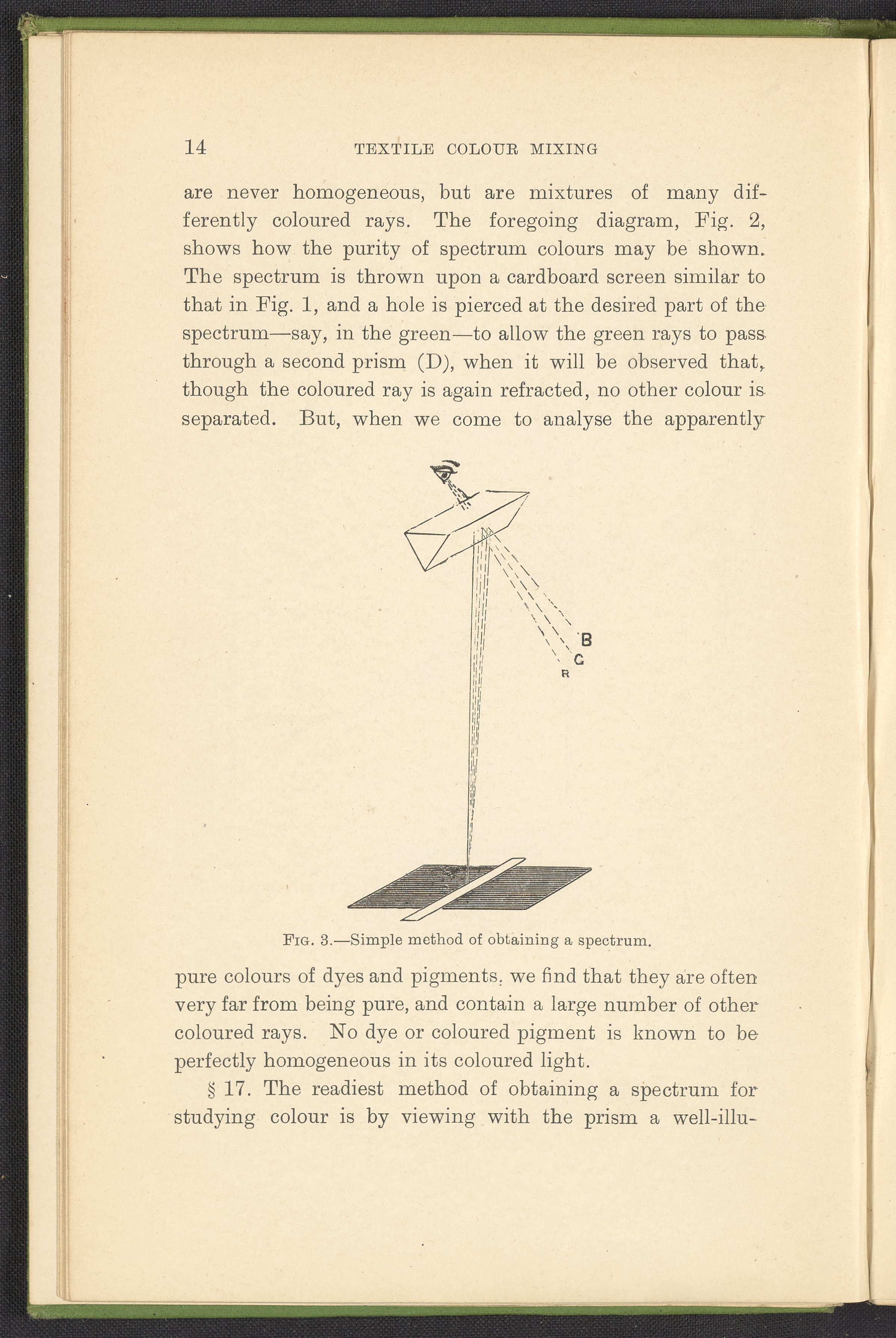 Small JPG1200 x 1784px — 330 KBFull-sized JPG2446 x 3636px — 1.2 MBOriginal fileTIFF — 2446 x 3636px — 25.5 MBA second revised edition of a text on color science. According to the author in his preface, this work deals “in a practical manner with the science of mixing ordinary colours and dyes… thus made applicable to the common everyday duties of the dyer and the colourist.” The work was written to complement the coursework of students enrolled in Textile Colleges as well as to provide technical context for color professionals. Contents include absorption spectroscopy, light waves and analysis, color mixing, primary colors, secondary colors, and tertiary shades. Includes five colored plates, four plates with dye samples, and 40 figures and illustrations. Work is digitized in its entirety.