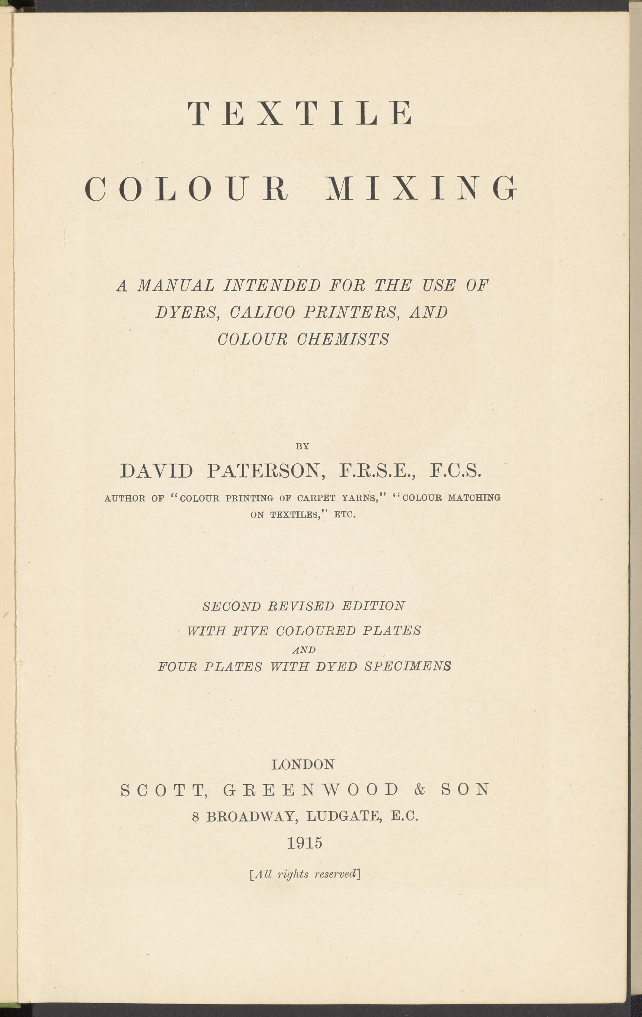 Paterson, David. Textile Colour Mixing; A Manual Intended for the Use of Dyers, Calico Printers, and Colour Chemists. London: Greenwood Scott, 1915. https://digital.sciencehistory.org/works/aph01mu.