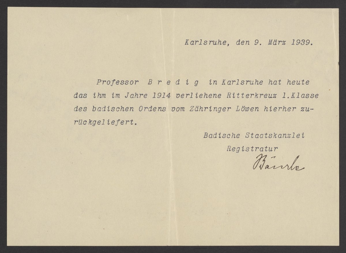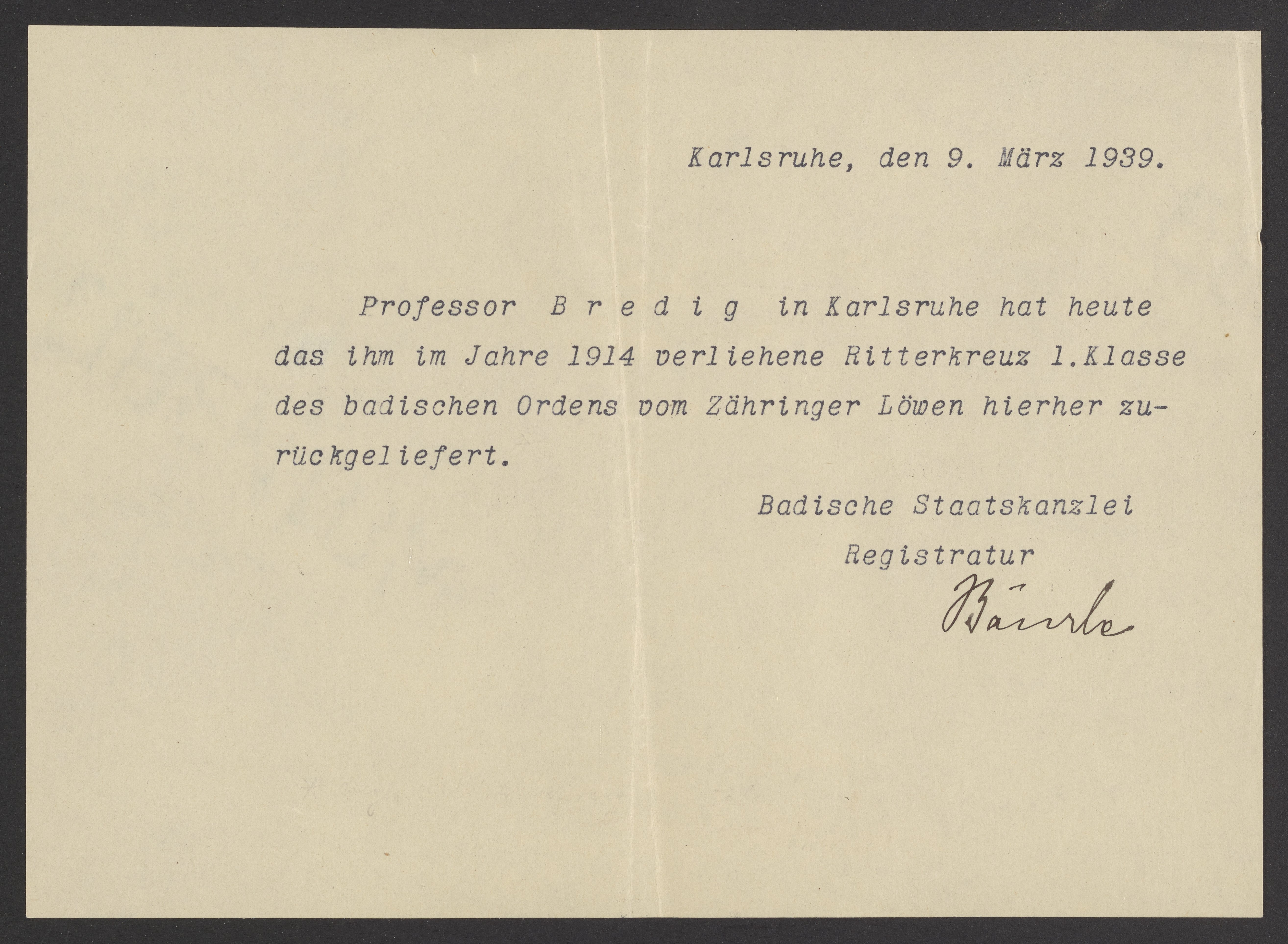 Letter from the Baden State Chancellery Registration to Georg Bredig
