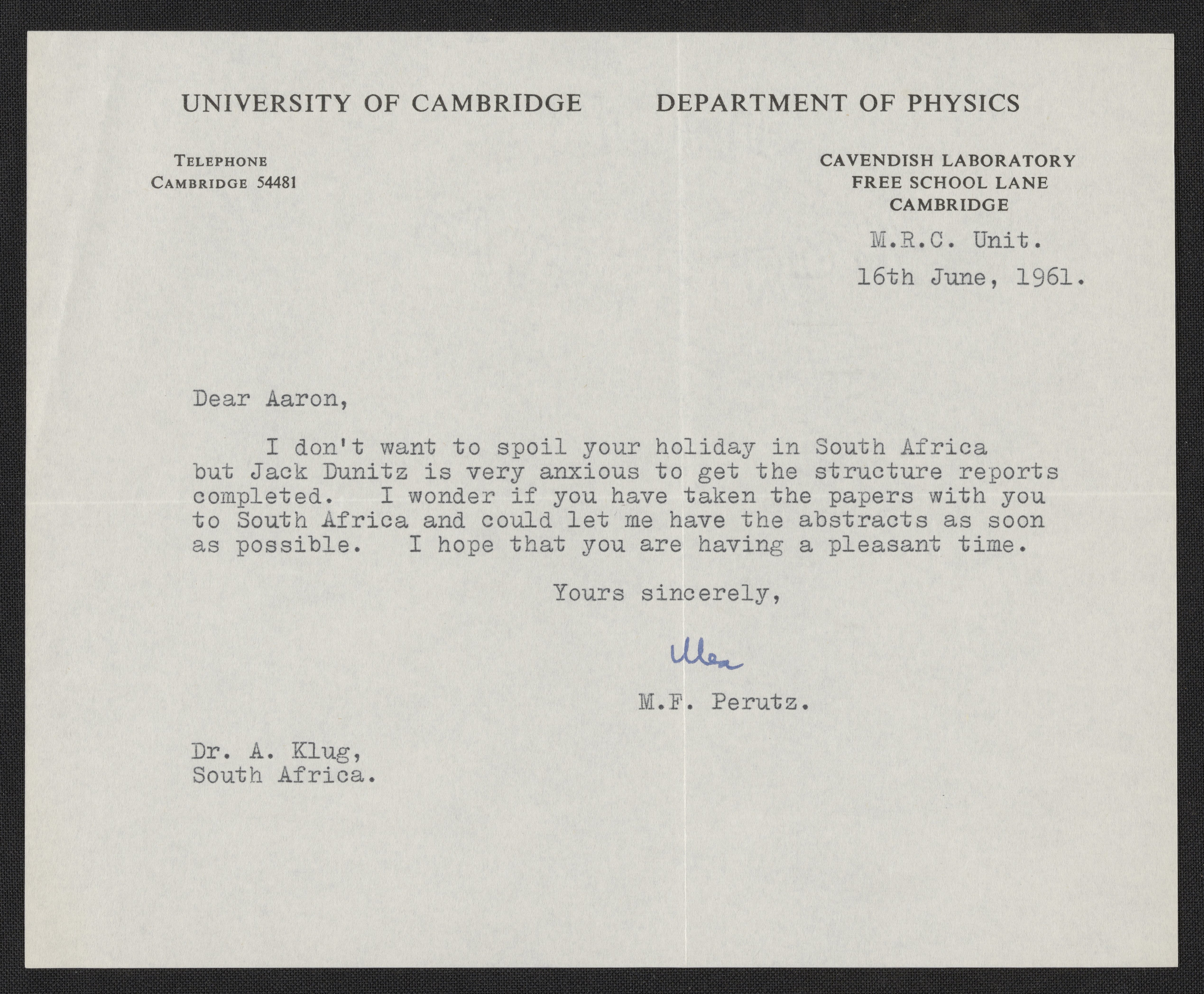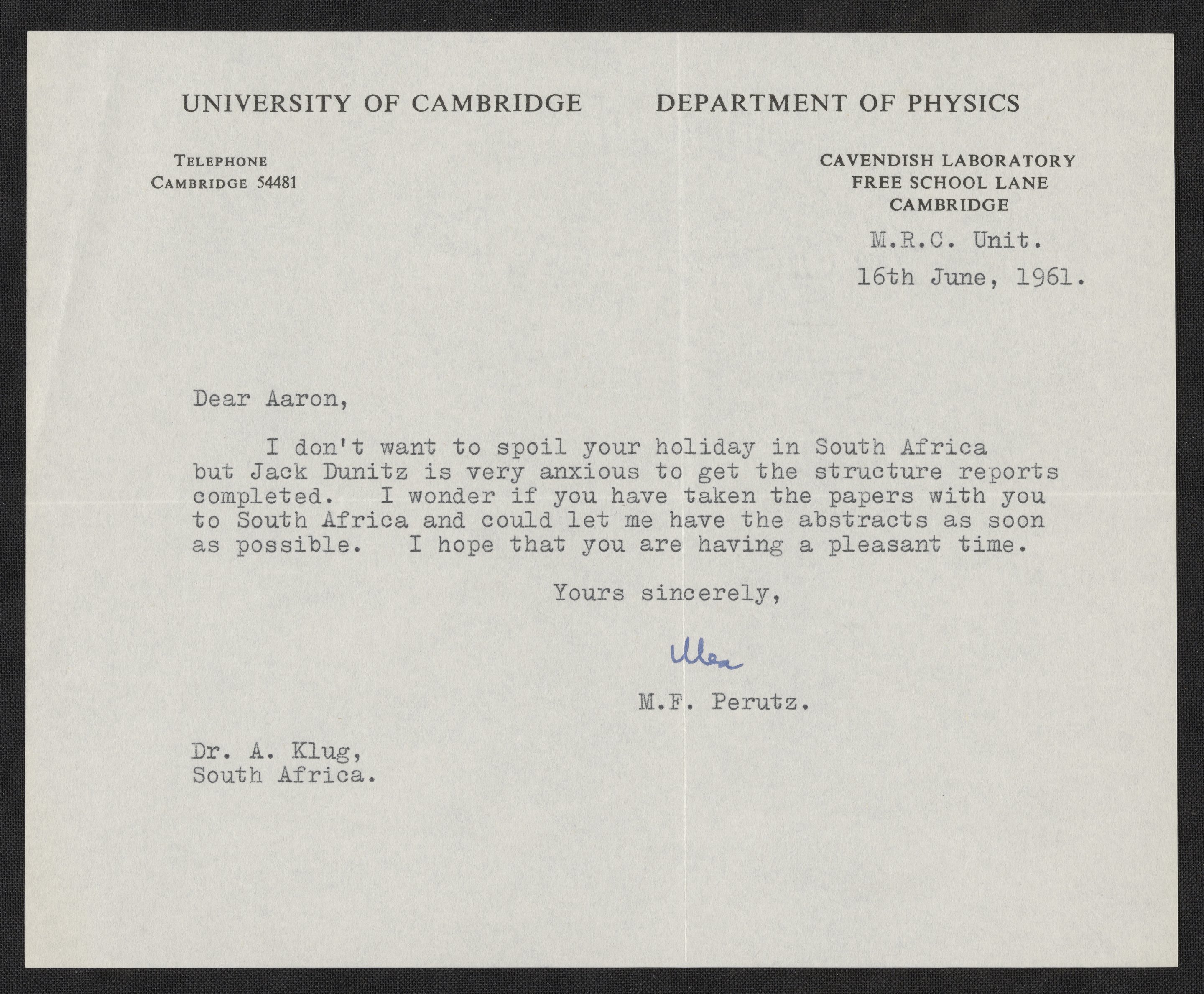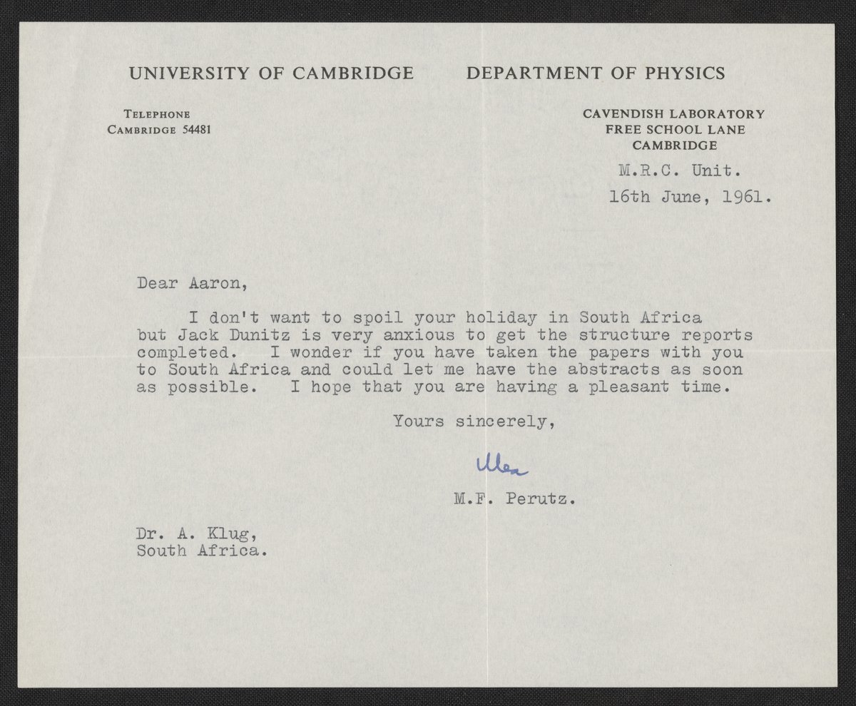 Letter from Max Perutz to Aaron Klug, June 16, 1961