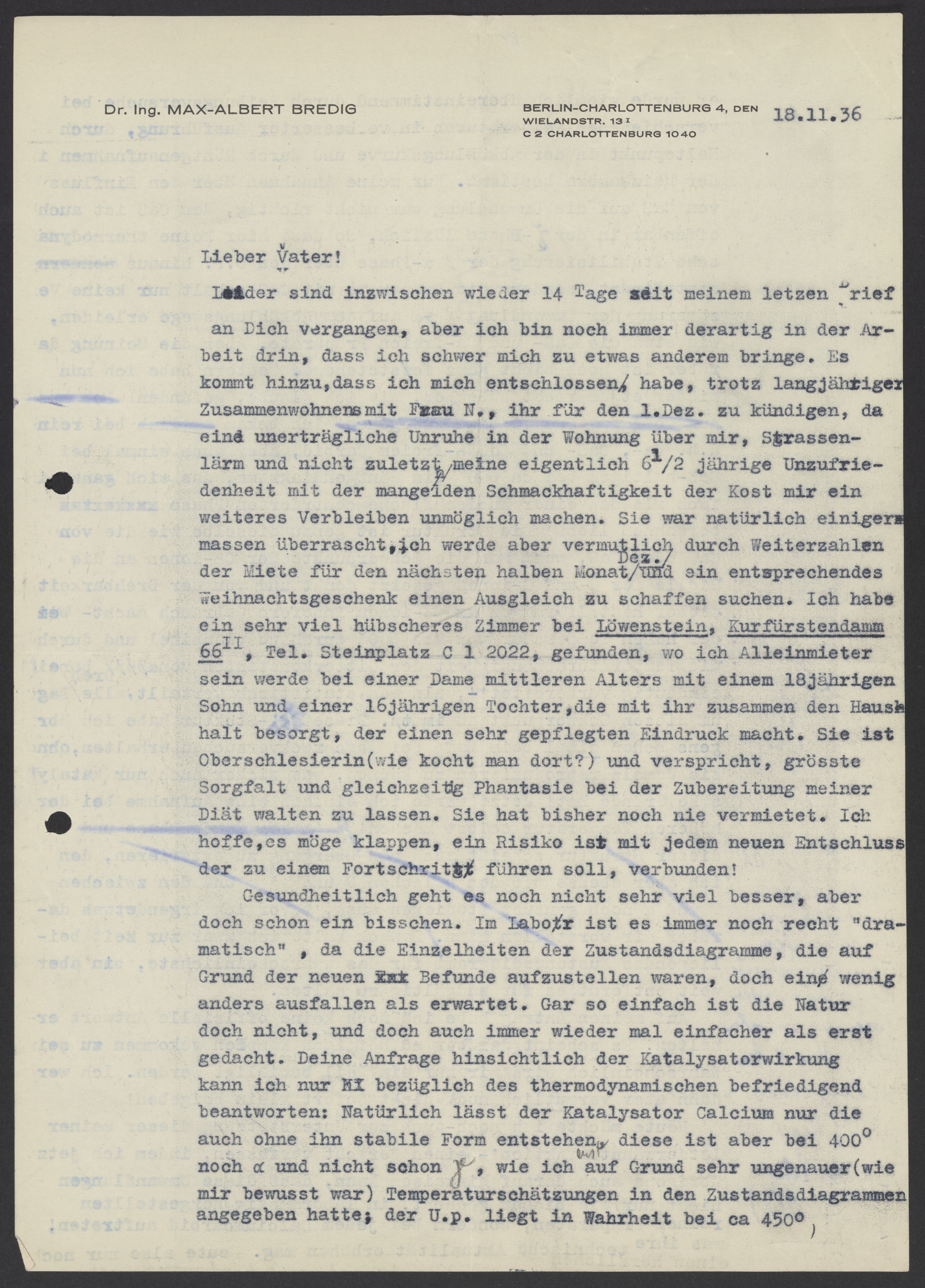 Letter from Max Bredig to Georg Bredig, November 3, 1936