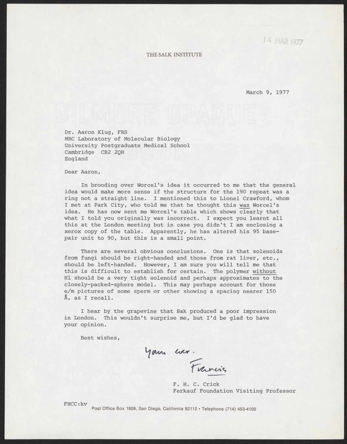 Letter from Francis Crick to Aaron Klug, March 9, 1977