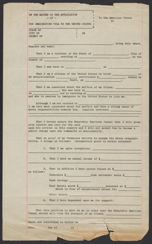 United States. Immigration and Naturalization Service. “Blank United States Affidavit Application,” 1940–1949. Papers of Georg and Max Bredig, Box 9, Folder 4. Science History Institute. Philadelphia. https://digital.sciencehistory.org/works/auqiw75.