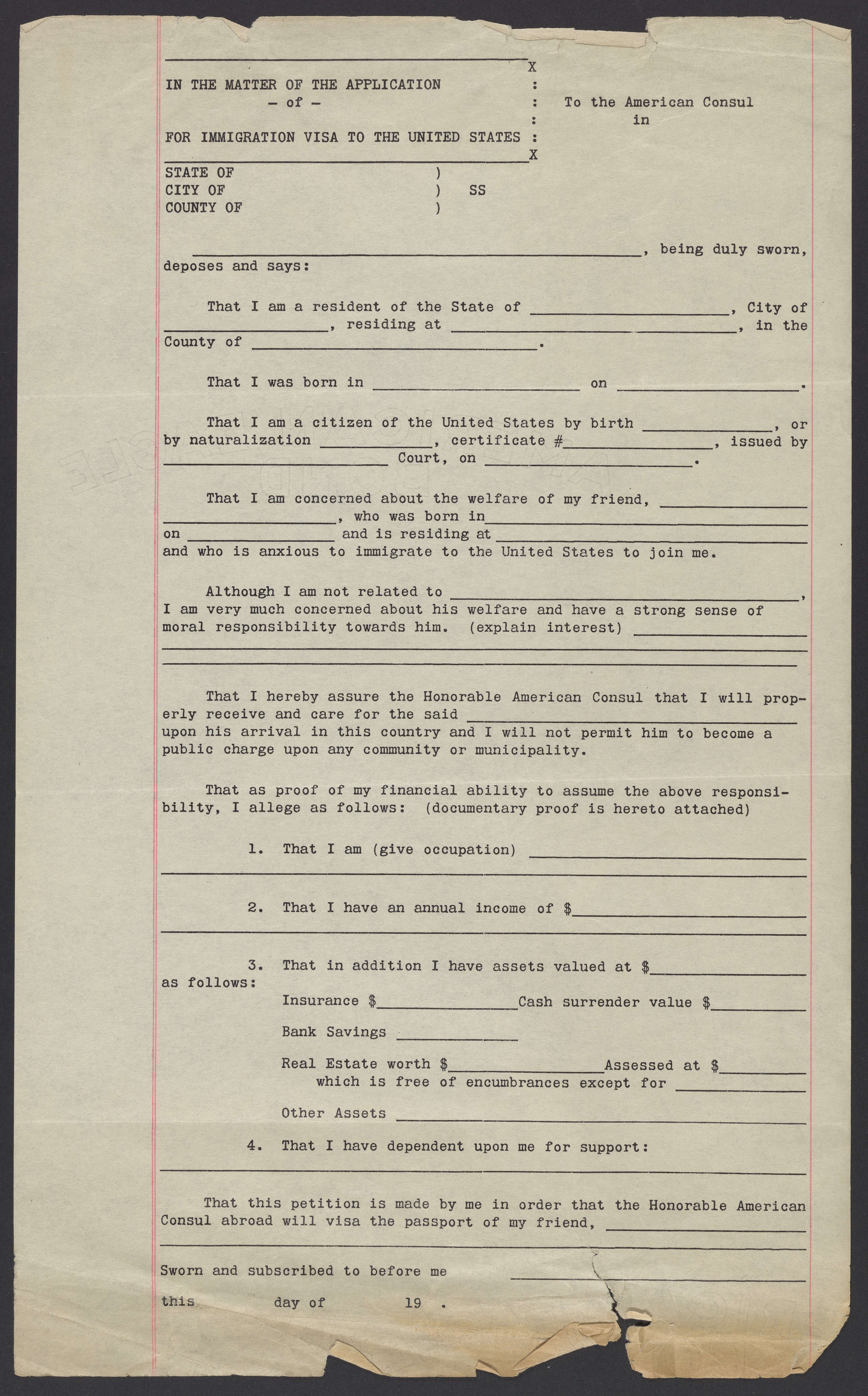 United States. Immigration and Naturalization Service. “Blank United States Affidavit Application,” 1940–1949. Papers of Georg and Max Bredig, Box 9, Folder 4. Science History Institute. Philadelphia. https://digital.sciencehistory.org/works/auqiw75.