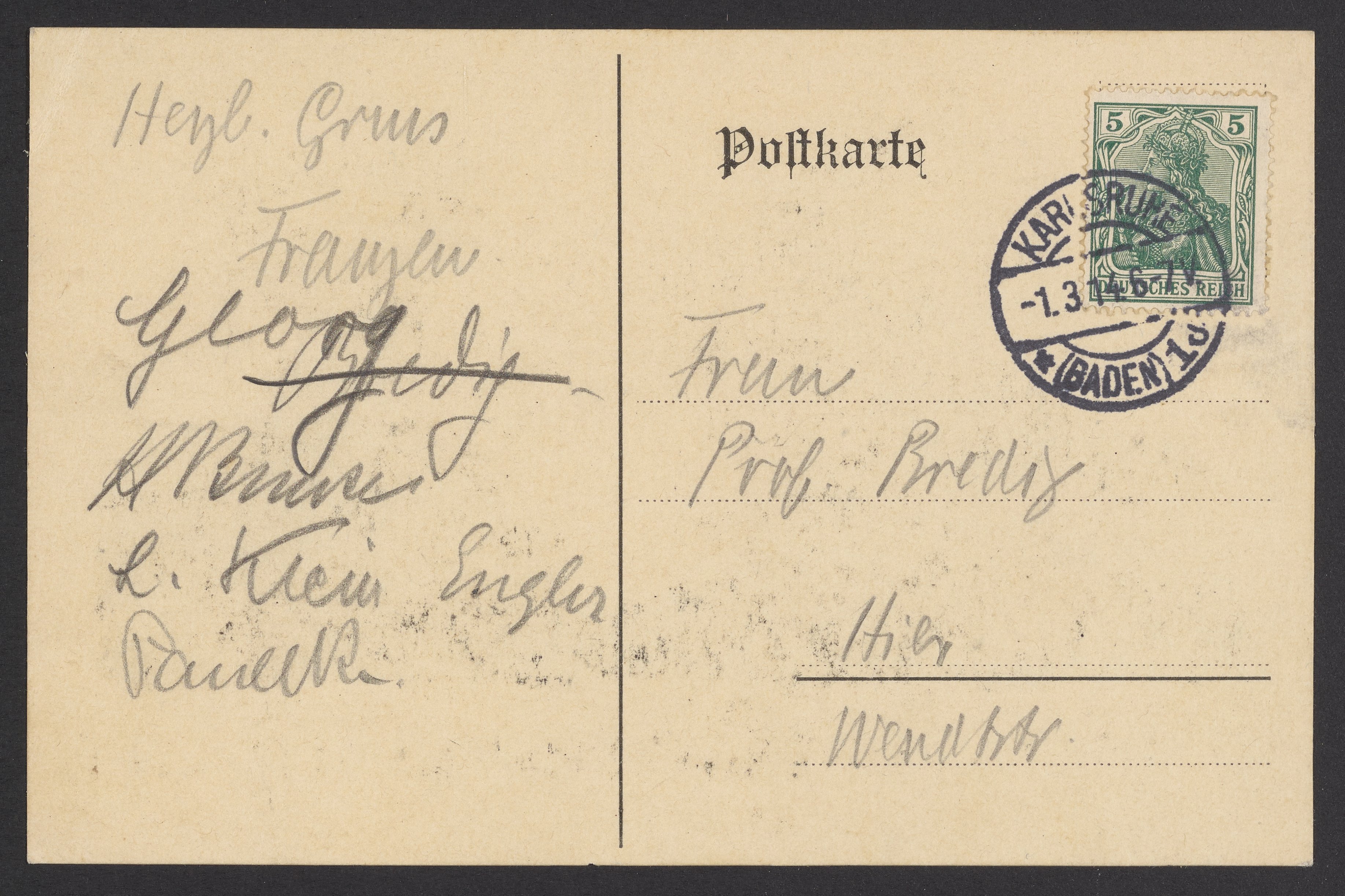 Small JPG1200 x 795px — 170 KBLarge JPG2880 x 1908px — 957 KBFull-sized JPG3692 x 2446px — 1.5 MBOriginal fileTIFF — 3692 x 2446px — 25.9 MBAutographed postcard from the Anniversary Festival Of The Karsruhe Chemical Society, sent by Georg Bredig (1868-1944) to his wife Rosa Bredig, née Fraenkel (1877-1933).