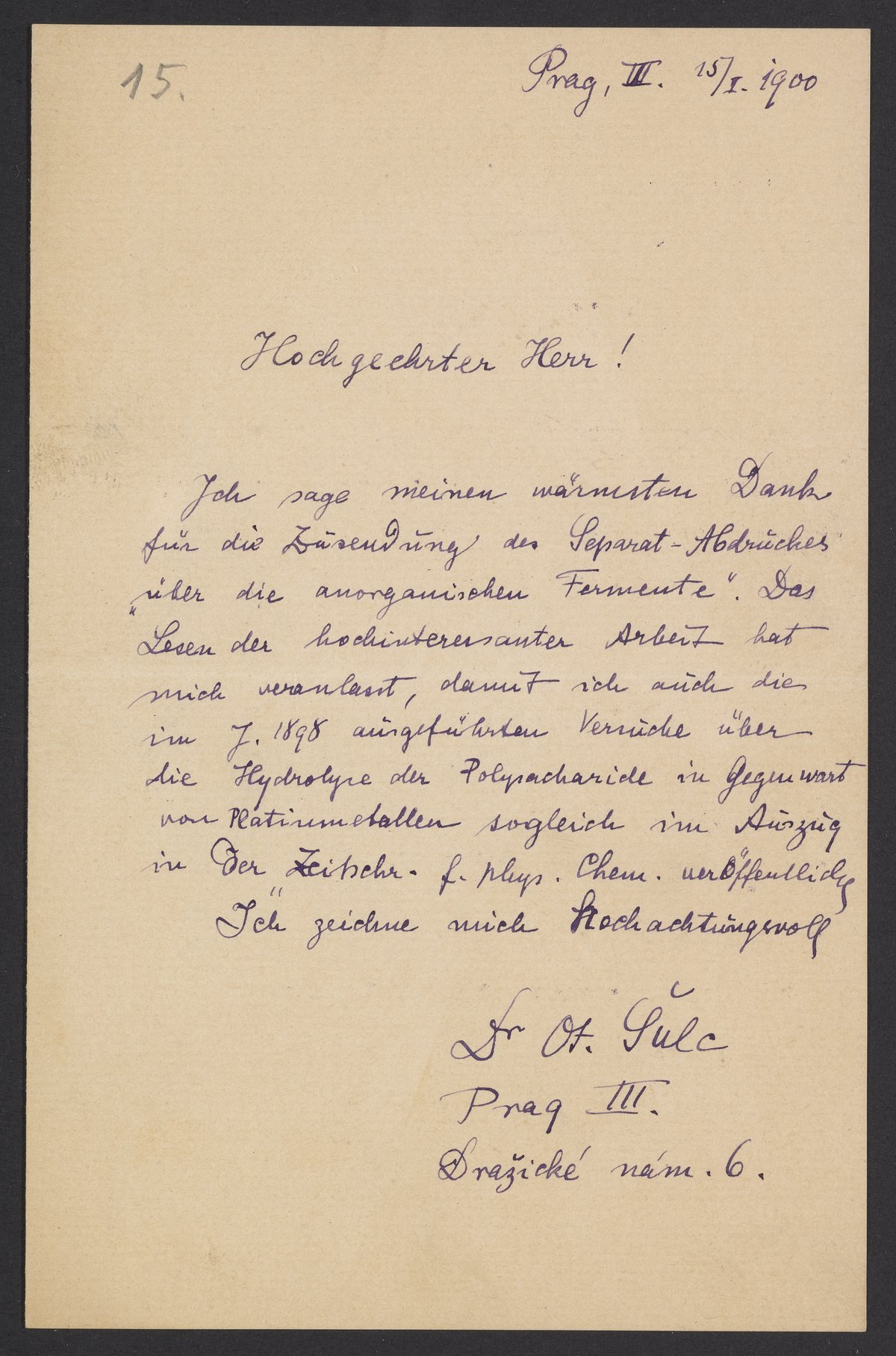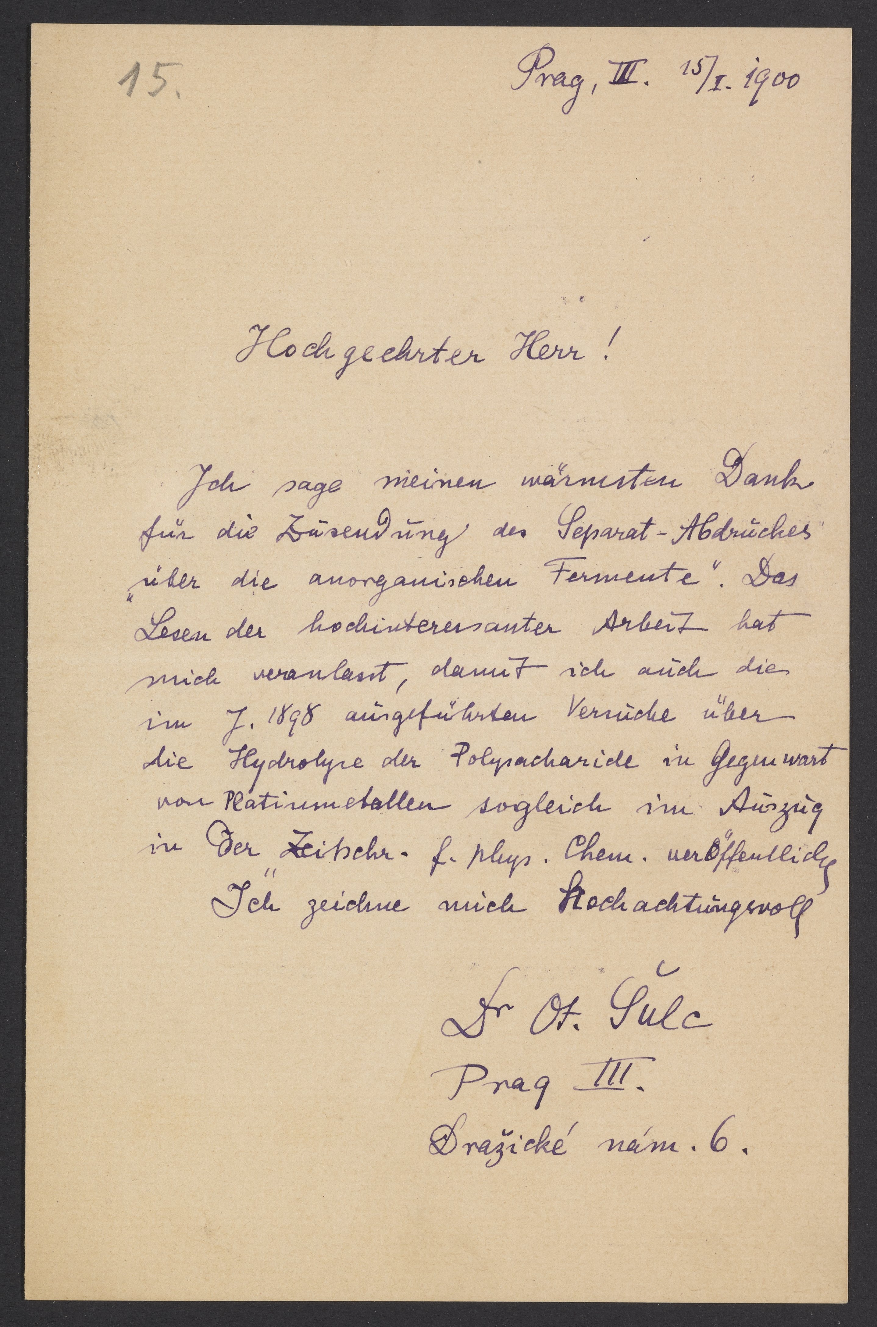Letter from Dr. O. Šulc to Georg Bredig, May 1900