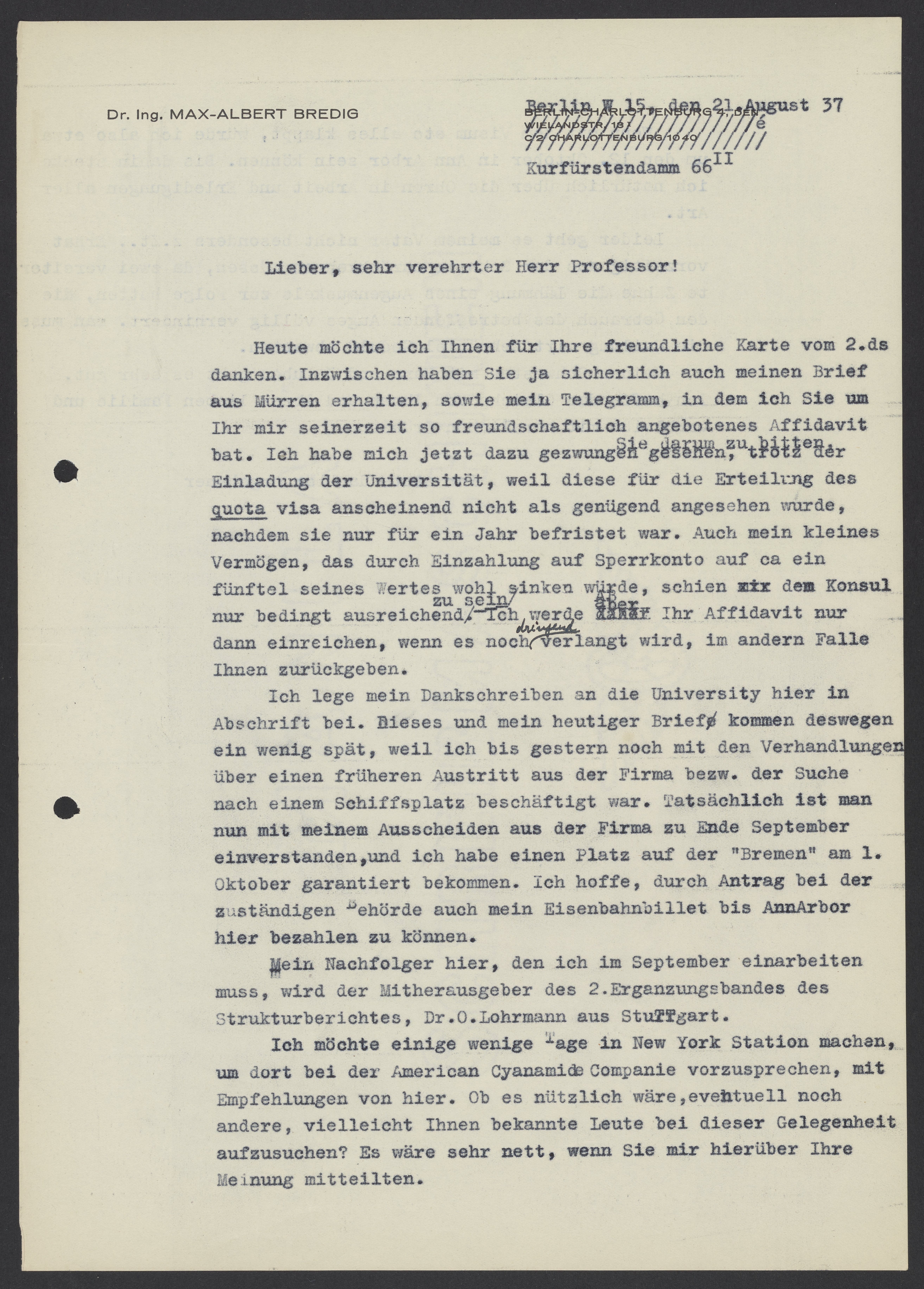 Heute möchte ich Ihnen für Ihre freundliche Karte vom 2. ds. Danken. Inzwischen haben Sie ja sicherlich auch meinen Brief aus Mürren erhalten, sowie mein Telegramm, in dem ich Sie um Ihr mir seinerzeit so freundschaftlich angebotenes Affidavit bat. Ich habe mich jetzt dazu gezwungen gesehen Sie darum zu bitten, trotz der Einladung der Universität, weil diese für die Erteilung des quota visa anscheinend nicht als genügend angesehen wurde, nachdem sie nur für ein Jahr befristet war. Auch mein kleines Vermögen, das durch Einzahlung auf Sperrkonto auf ca. ein fünftel seines Wertes wohl sinken würde, schien dem Konsul nur bedingt ausreichend zu sein. Ich werde aber Ihr Affidavit nur dann einreichen, wenn es noch dringend verlangt wird, im andern Falle Ihnen zurückgeben.
