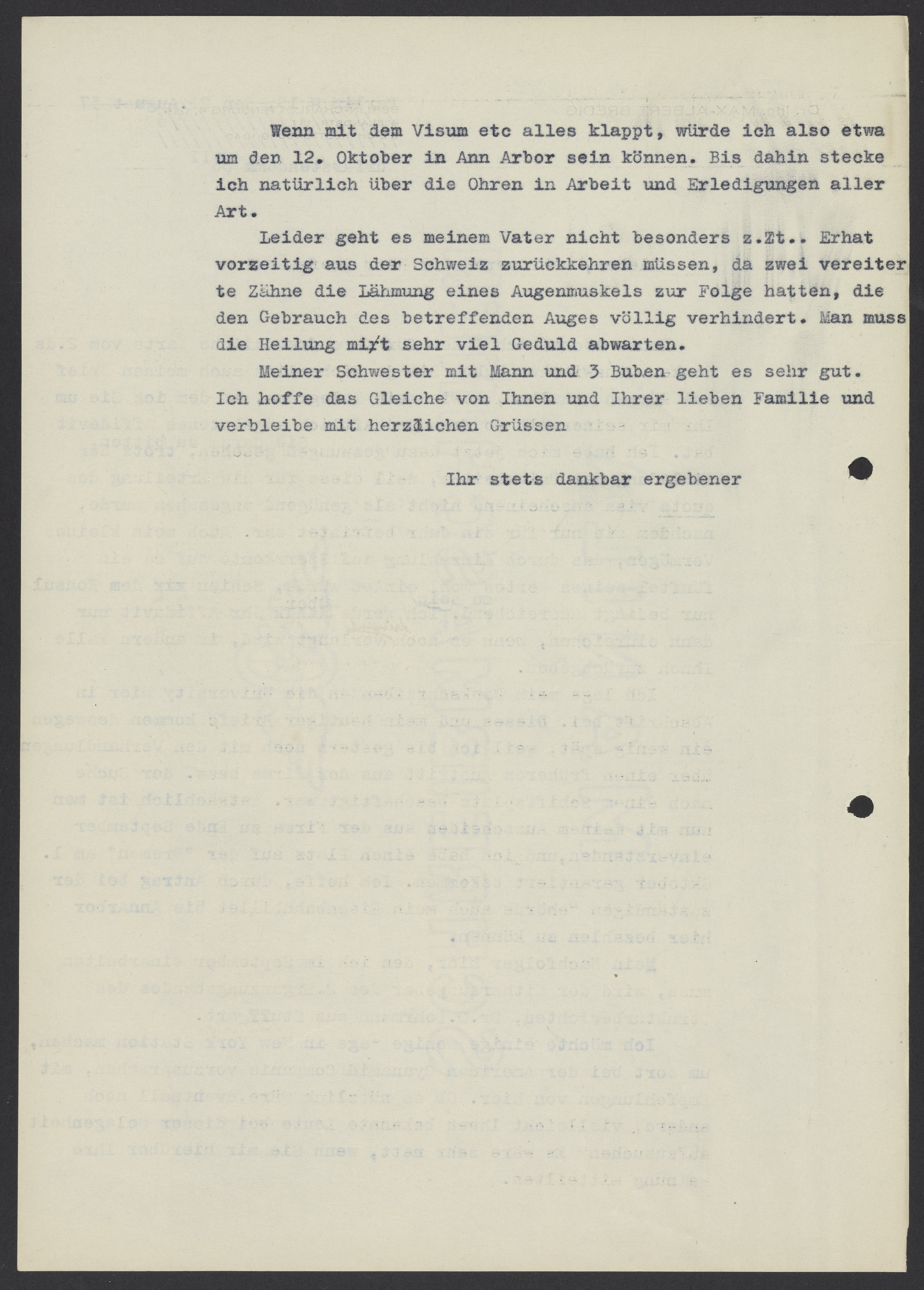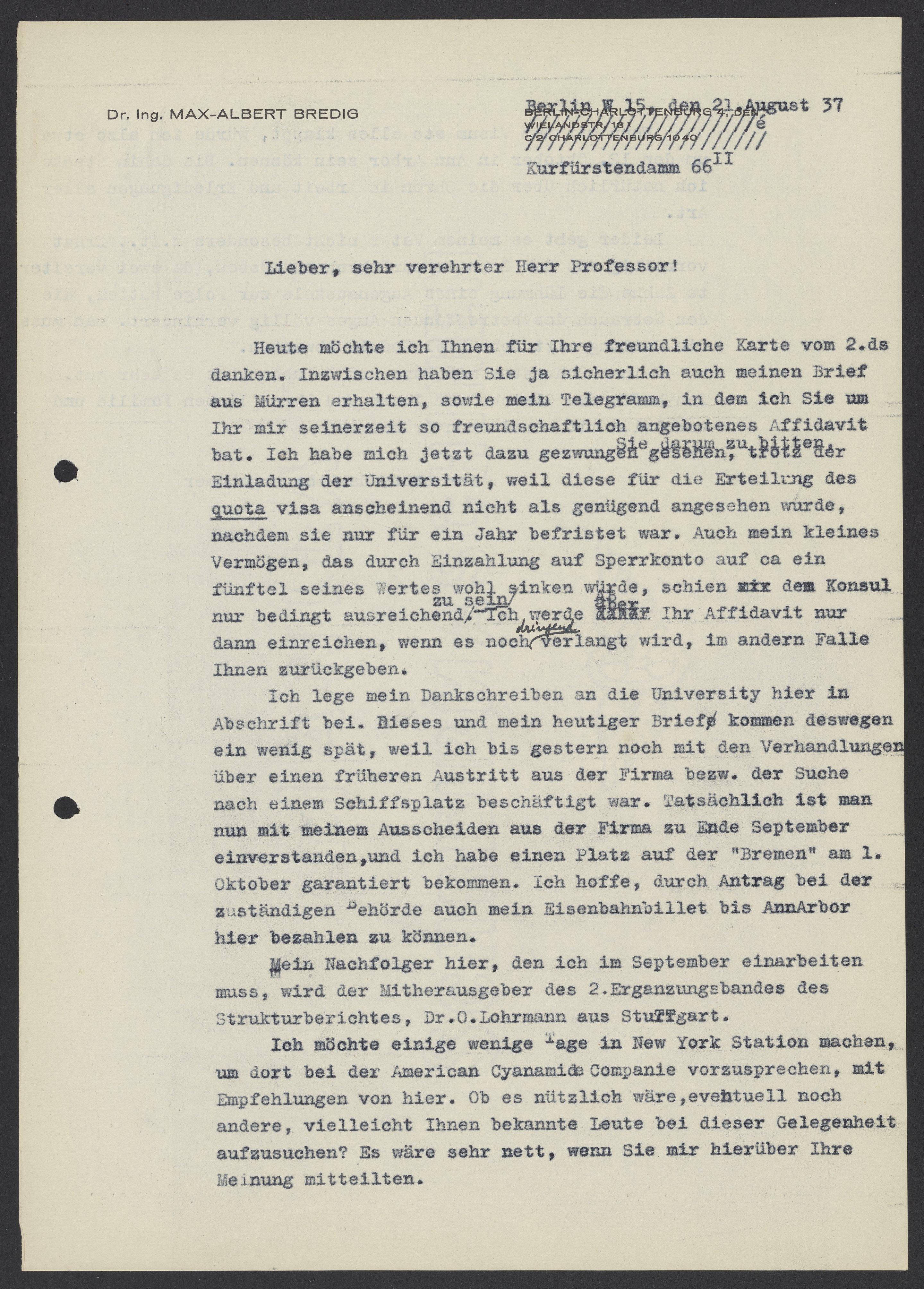 Ich lege mein Dankschrieben an die University hier in Abschrift bei. Dieses und mein heutiger Brief kommen deswegen ein wenig spät, weil ich bis gestern noch mit den Verhandlungen über einen früheren Austritt aus der Firma bezw. der Suche nach einen Schiffsplatz beschäftigt war. Tatsächlich ist man nun mit meinen Ausscheiden aus der Firma zu Ende September einverstanden, und ich habe einen Platz auf der “Bremen” am 1. Oktober garantiert bekommen. Ich hoffe, durch Antrag bei der zuständigen Behörde auch mein Eisenbahnbillet bis Ann Arbor hier bezahlen zu können.