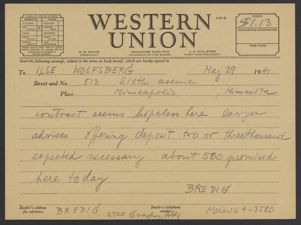 Telegram from Max Bredig to Ilse Wolfsberg, May 29, 1941