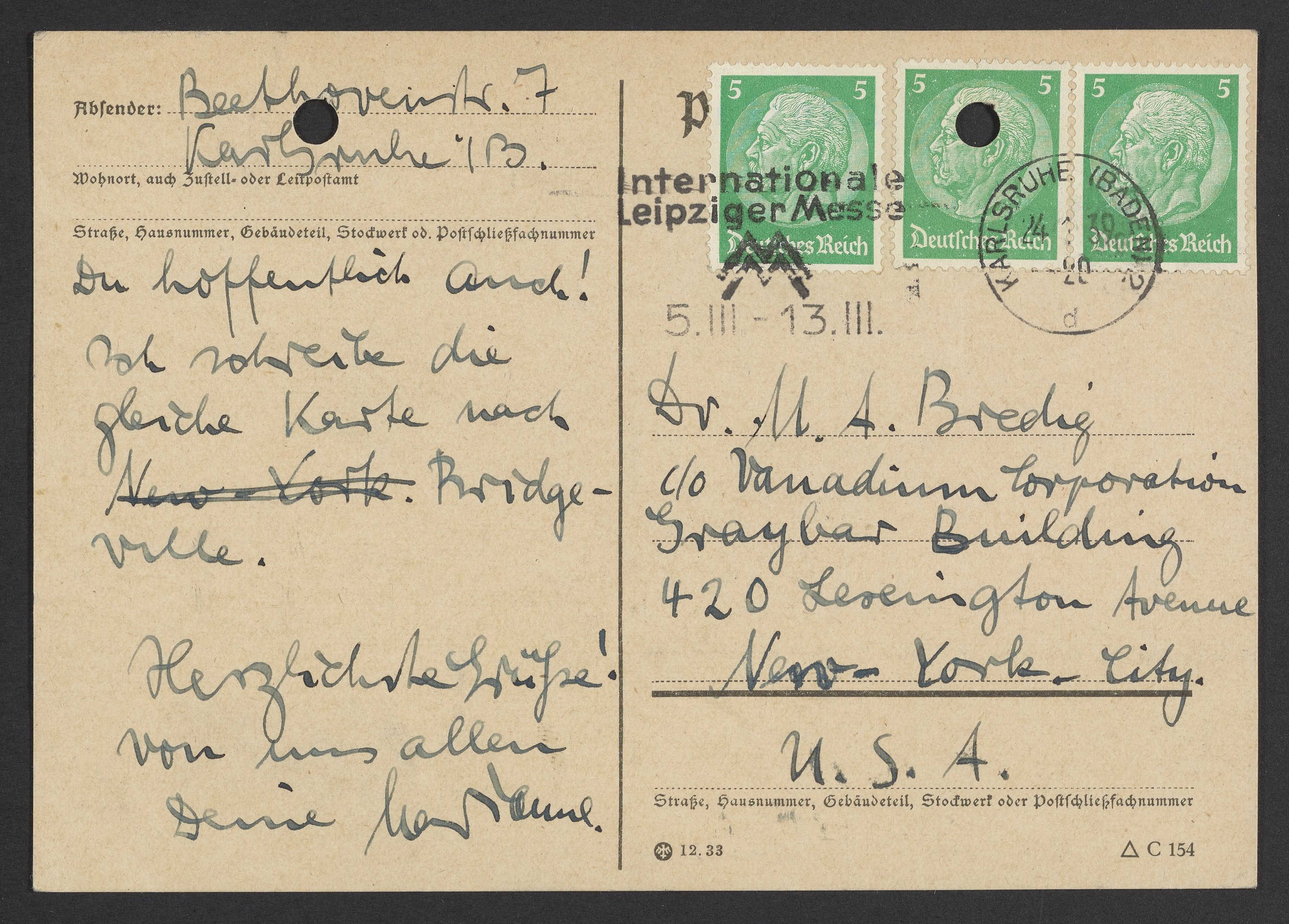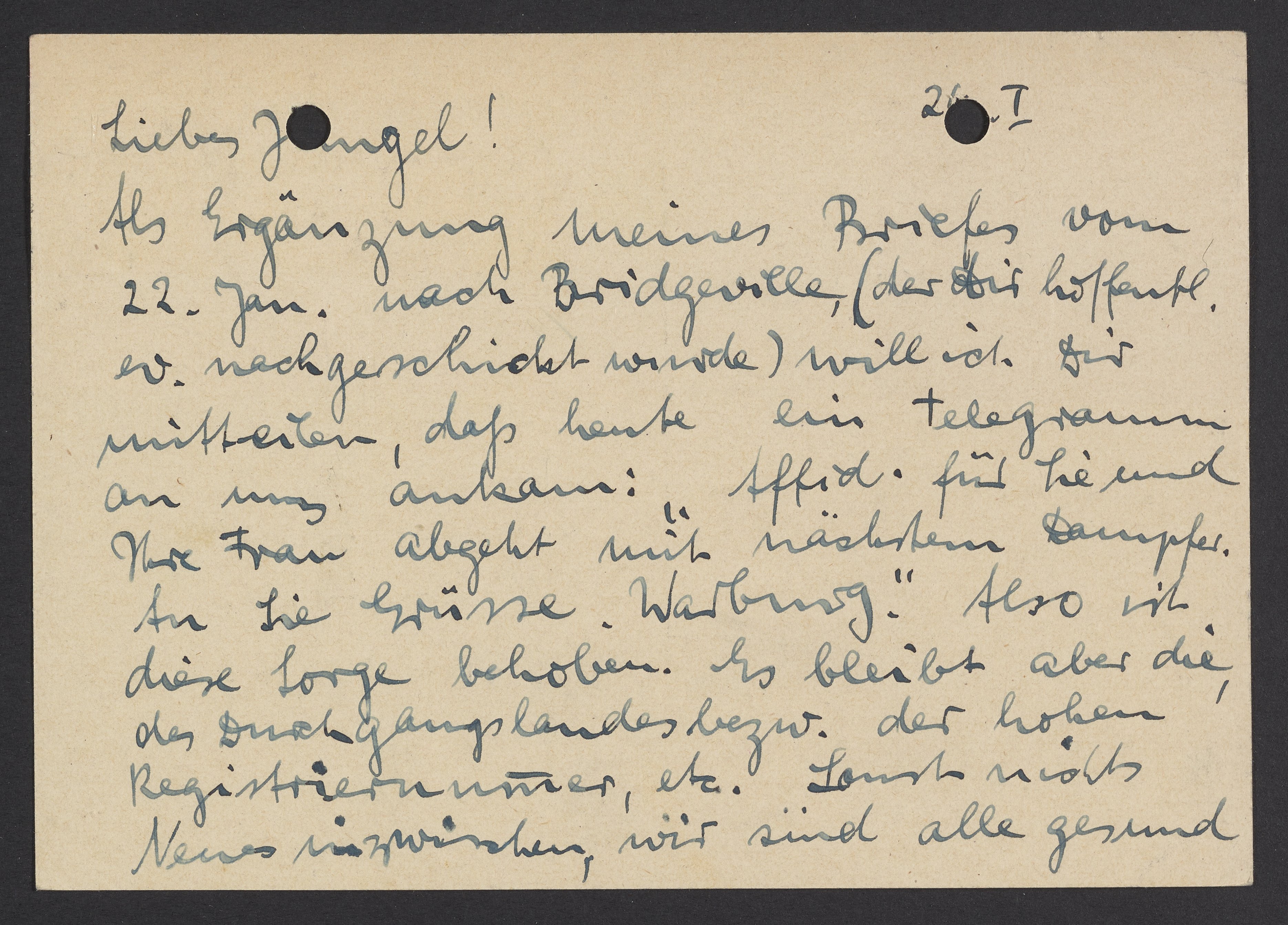 Postcard from Marianne Homburger to Max Bredig, January 24, 1939