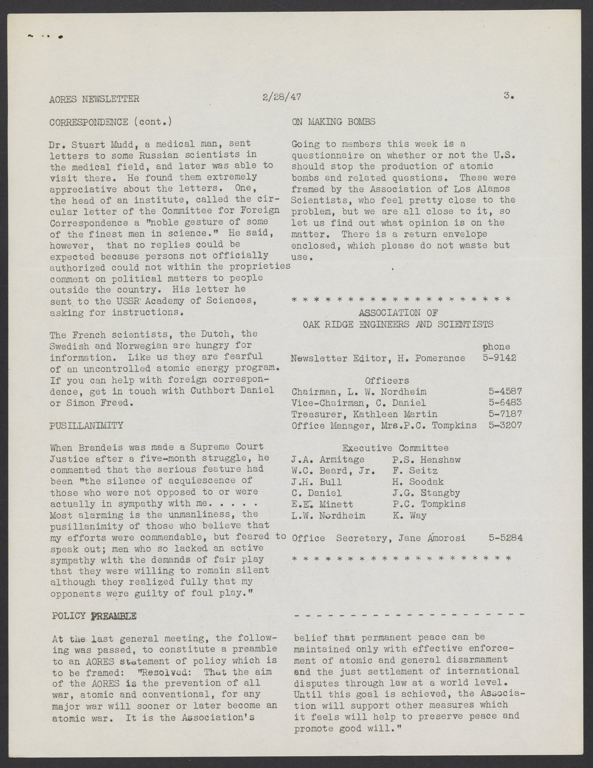 Association of Oak Ridge Engineers and Scientists. “Newsletter for the Association of Oak Ridge Engineers and Scientists (AORES), February 28, 1947,” February 28, 1947. Papers of Georg and Max Bredig, Box 10, Folder 4. Science History Institute. Philadelphia. https://digital.sciencehistory.org/works/b264vru.