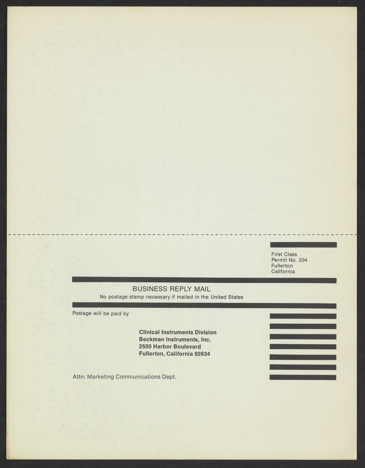 Small JPG1200 x 1520px — 175 KBFull-sized JPG2742 x 3473px — 729 KBOriginal fileTIFF — 2742 x 3473px — 27.3 MBMarketing materials tout the virtues of the Beckman Glucose Analyzer, with emphasis placed upon verification of claims by the Standards Committee of the College of American Pathologists. The folded brochure includes a letter and mailer with return postage.