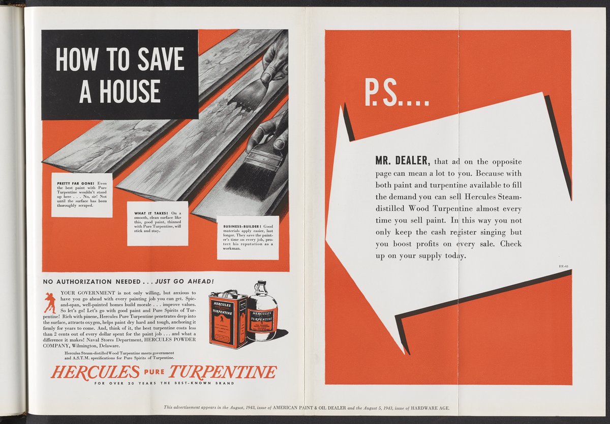 Hercules Incorporated. “How to Save a House.” 1943 Hercules Advertisements, 1943. Records of Hercules Incorporated, Volume 1943. Science History Institute. Philadelphia. https://digital.sciencehistory.org/works/b2773w45d.