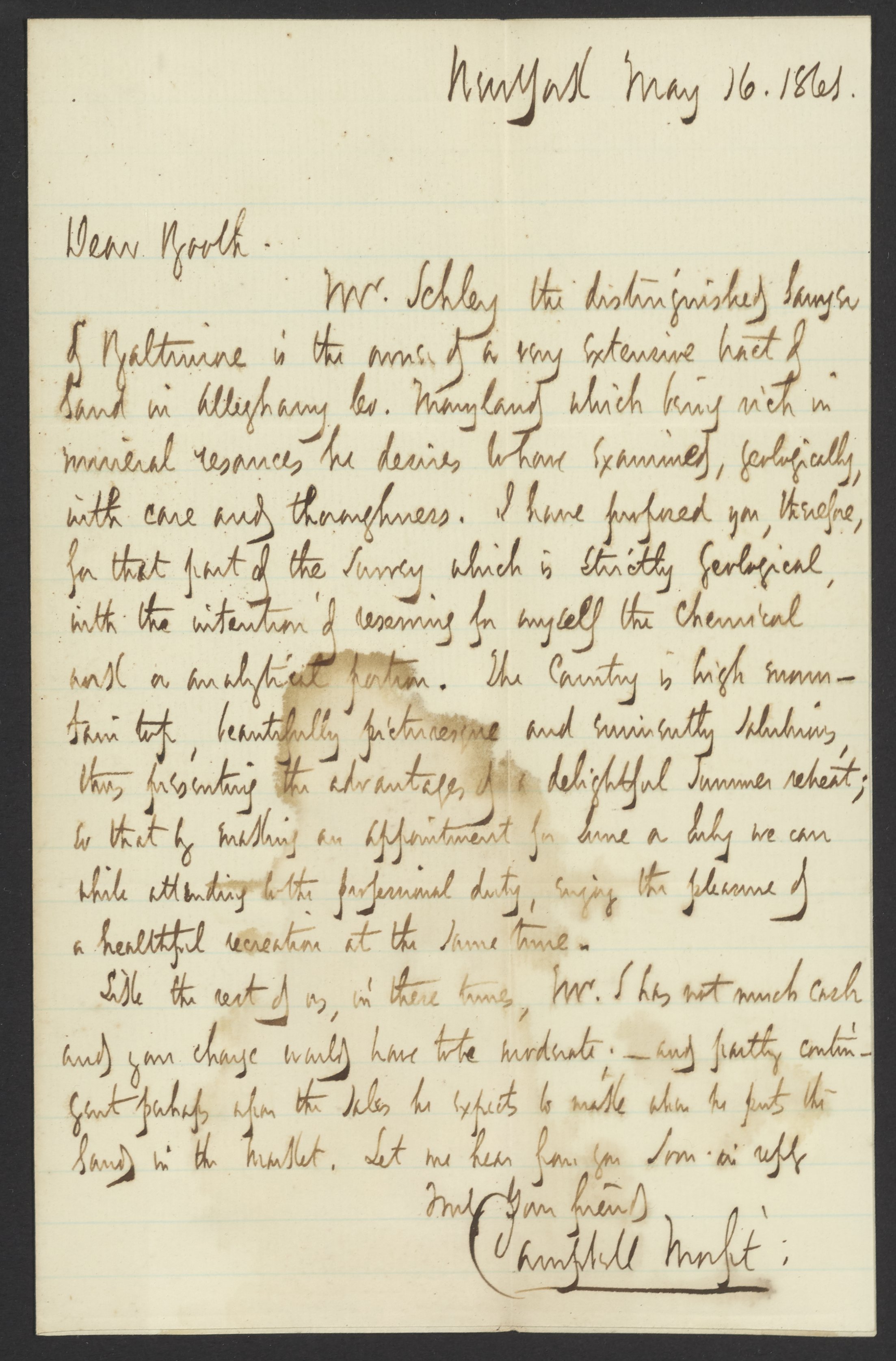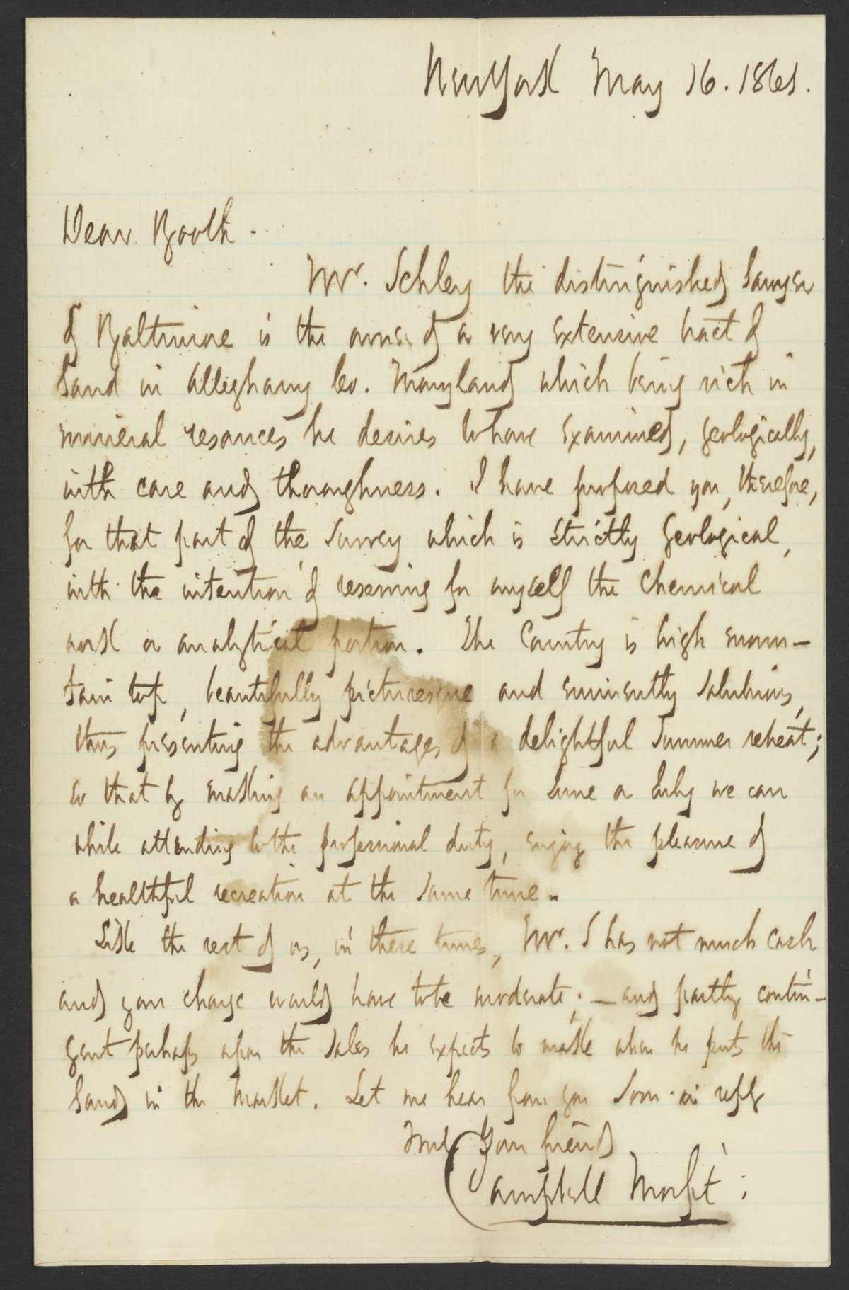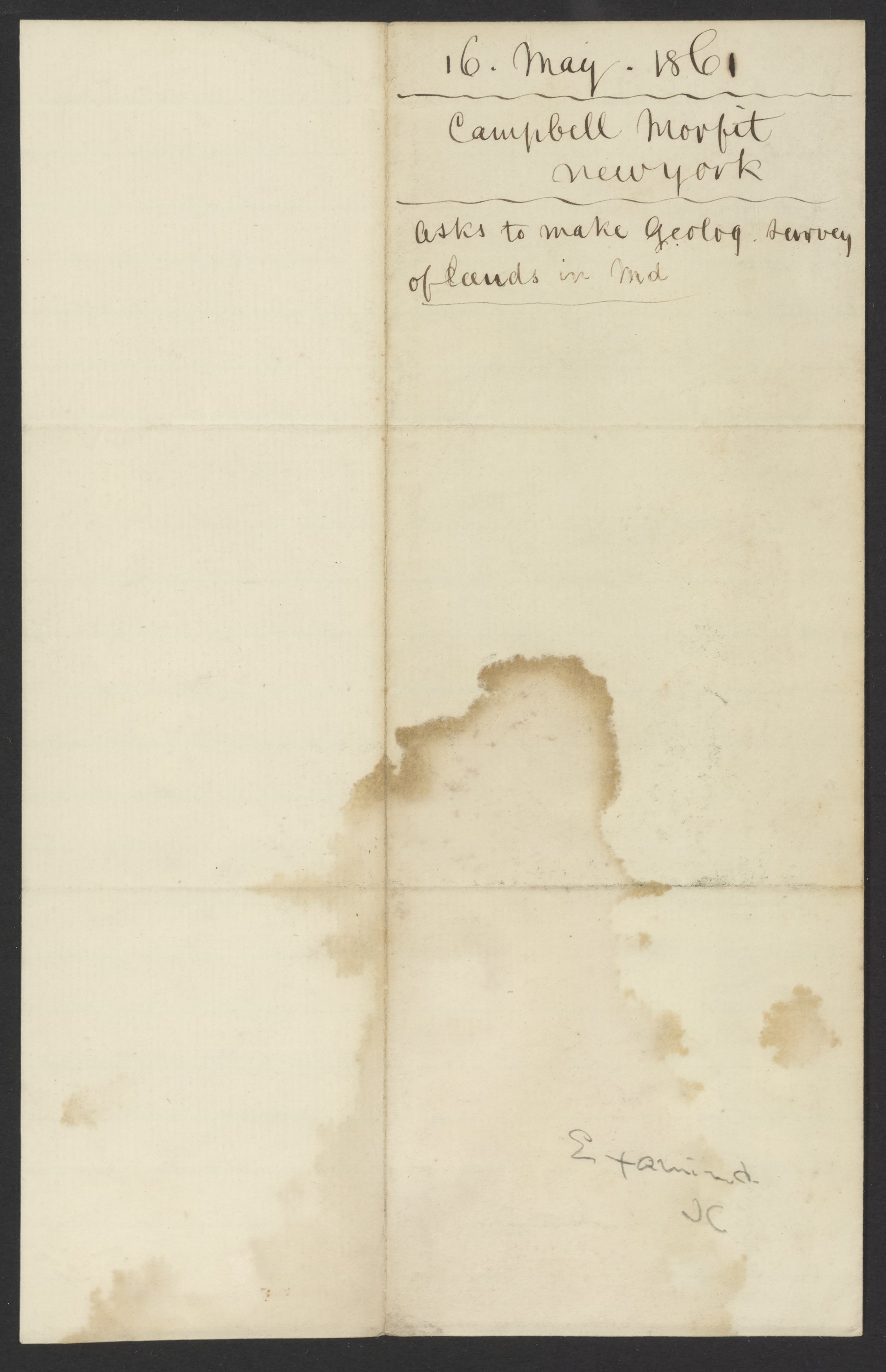 Small JPG1200 x 1822px — 294 KBFull-sized JPG2206 x 3350px — 743 KBOriginal fileTIFF — 2206 x 3350px — 21.2 MBCampbell Morfit (1820-1897), a distinguished chemist from the United States, co-editor with James Curtis Booth (1810-1888) of the Encyclopedia of Chemistry (1850), writes to offer Booth the chance to conduct a geological survey of some lands in Maryland.
