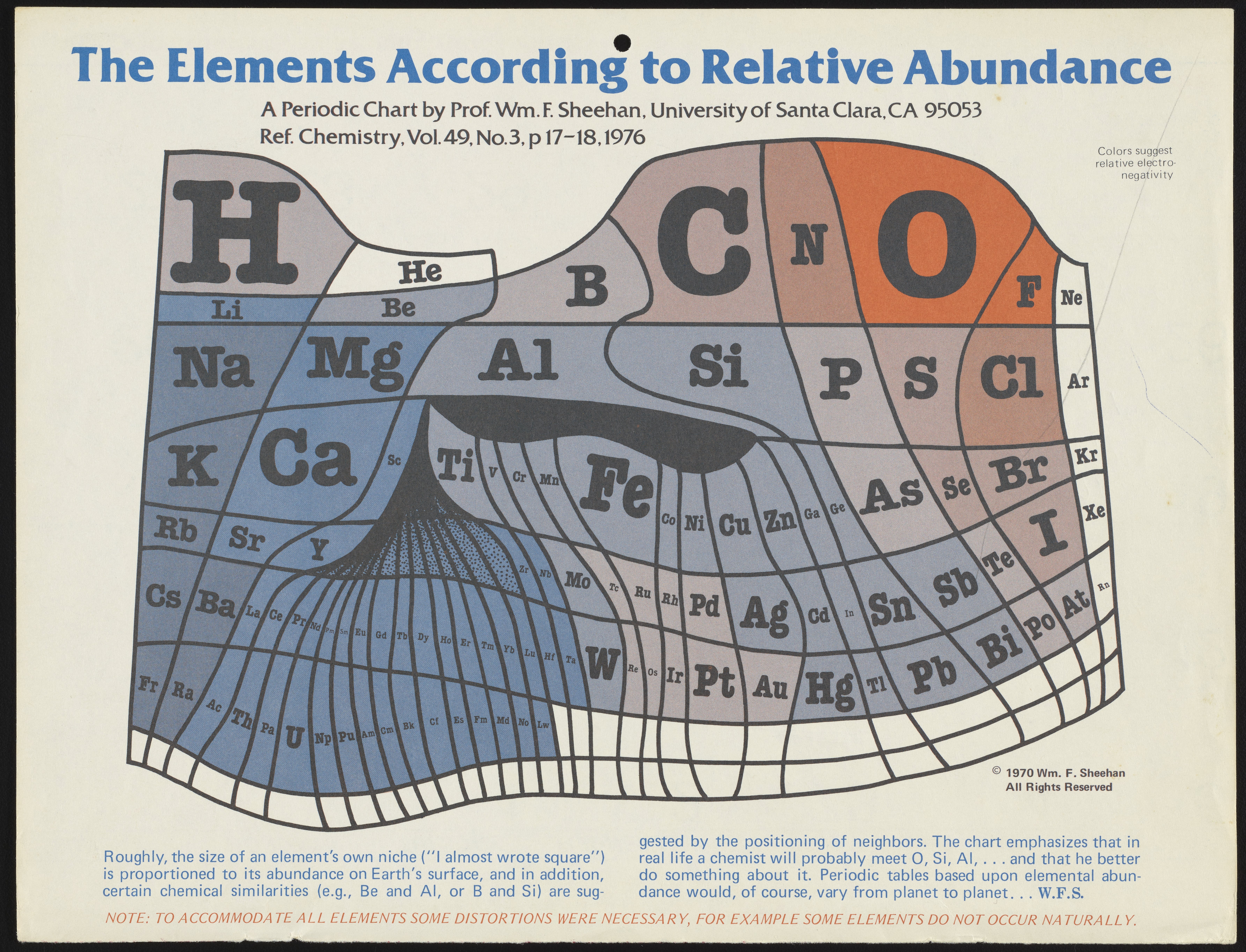 Sheehan, William F. “The Elements According to Relative Abundance.” Cheltenham (Township), Pennsylvania: Instruments for Research and Industry, 1970. Periodic Tables Collection, Box FC-5, Folder Periodic Tables (Assorted). Science History Institute. Philadelphia. https://digital.sciencehistory.org/works/b5644s48g.