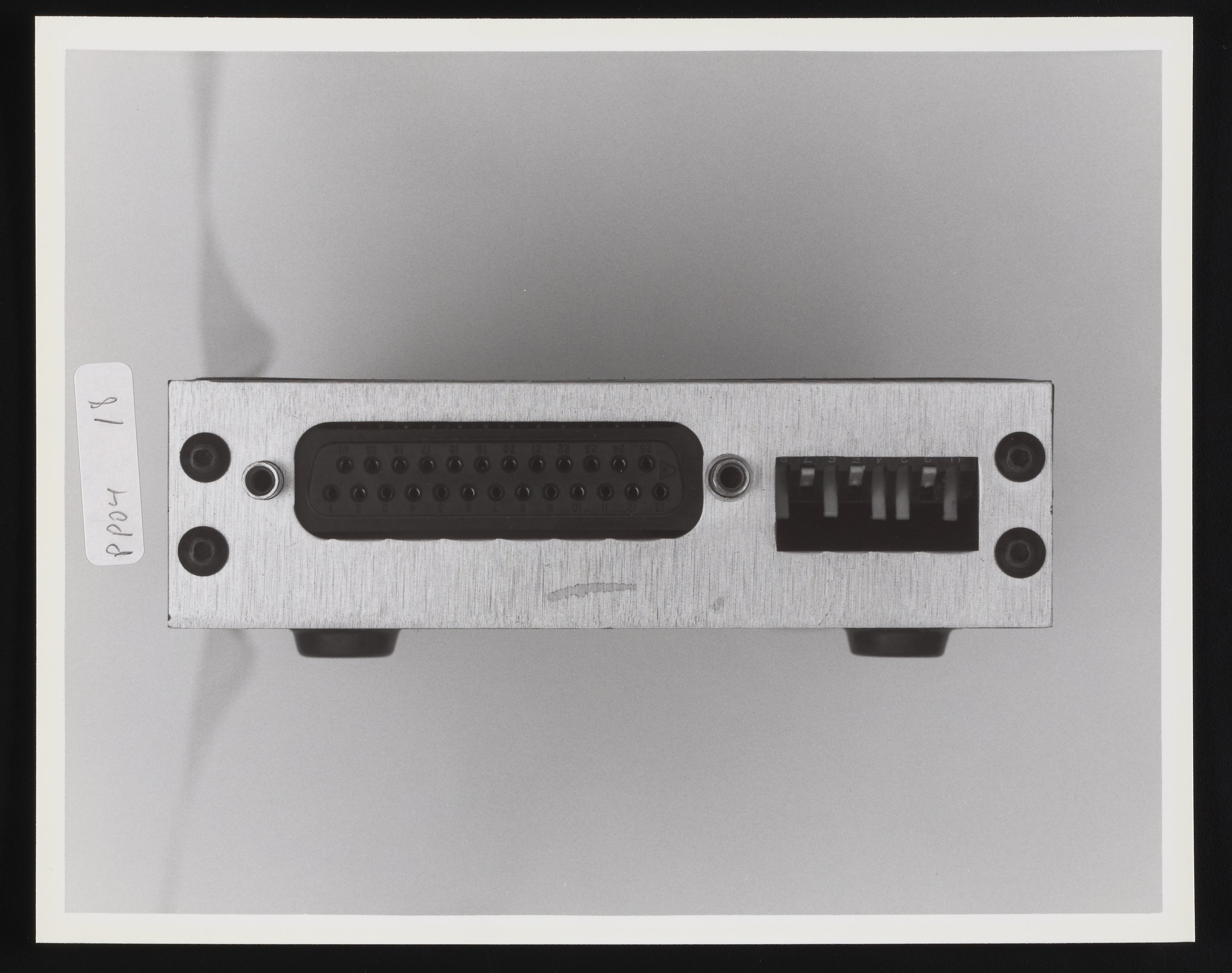 The inventory that accompanies the photo album containing this image only says that this mysterious "fixture" is "home made." The port on the left is likely a serial DB-25 port.