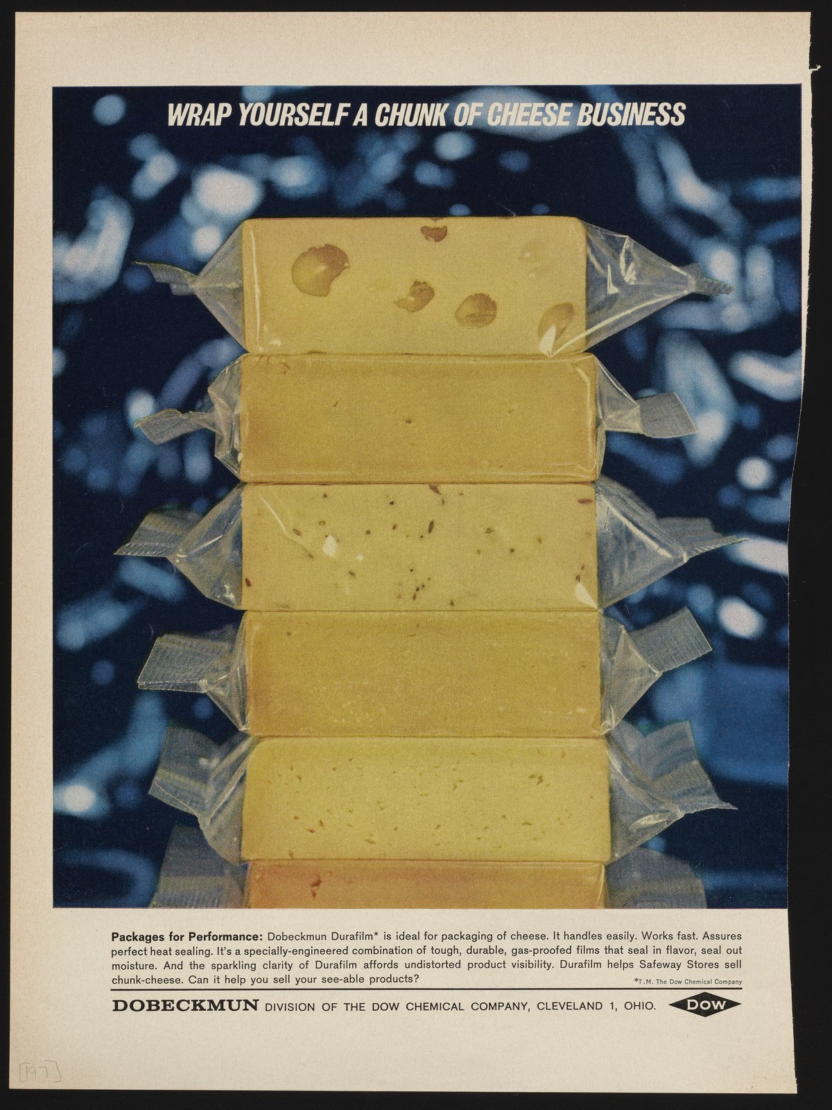 Dow Chemical Company. “Wrap Yourself a Chunk of Cheese Business,” n.d. Advertisements from the Dow Chemical Historical Collection, Box 7. Science History Institute. Philadelphia. https://digital.sciencehistory.org/works/b8515p05x.