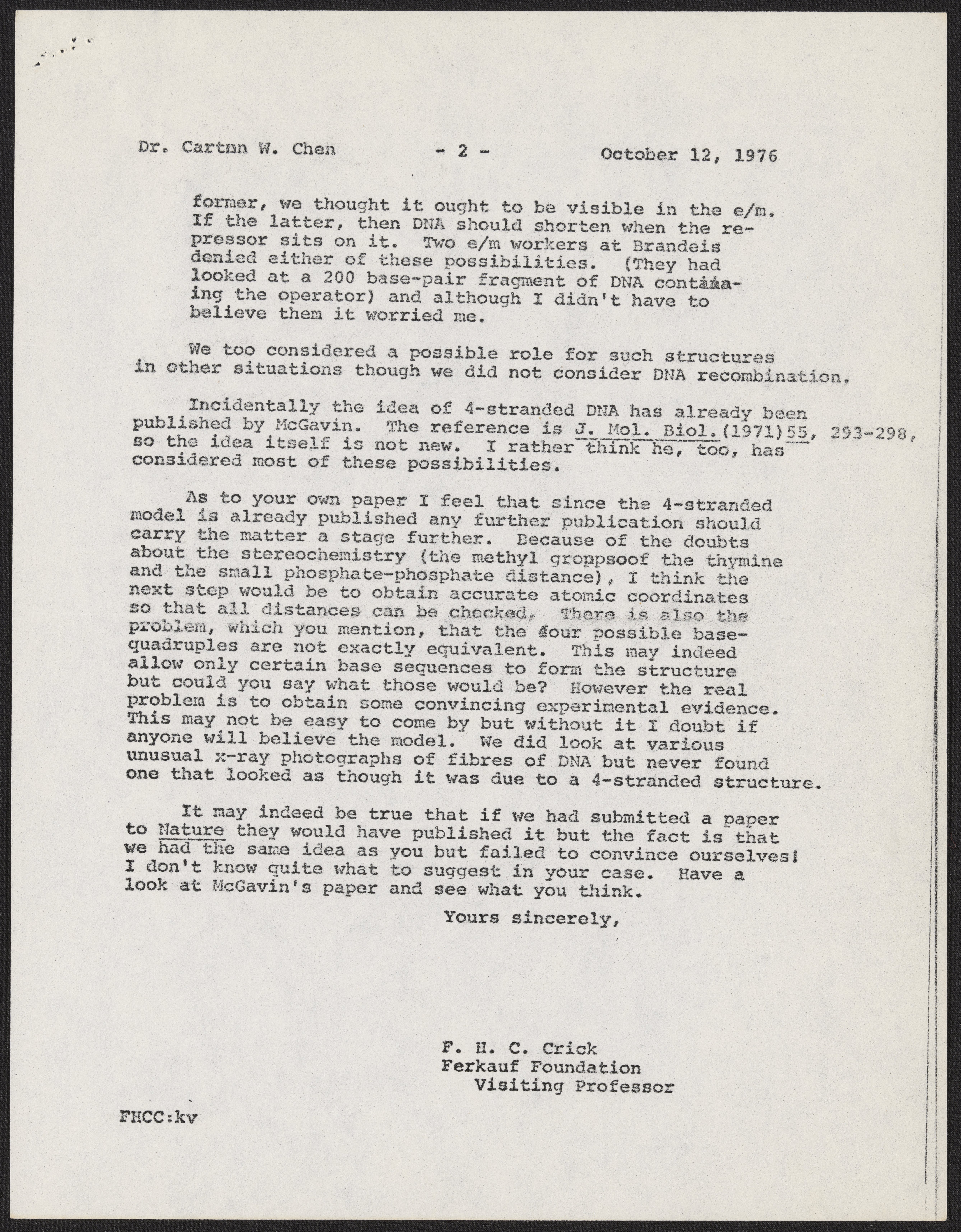 Crick, Francis. “Letter from Francis Crick to Carton W. Chen, October 12, 1976,” October 12, 1976. History of Molecular Biology Collection, Box 19, Folder 25. Science History Institute. Philadelphia. https://digital.sciencehistory.org/works/b87nkgf.