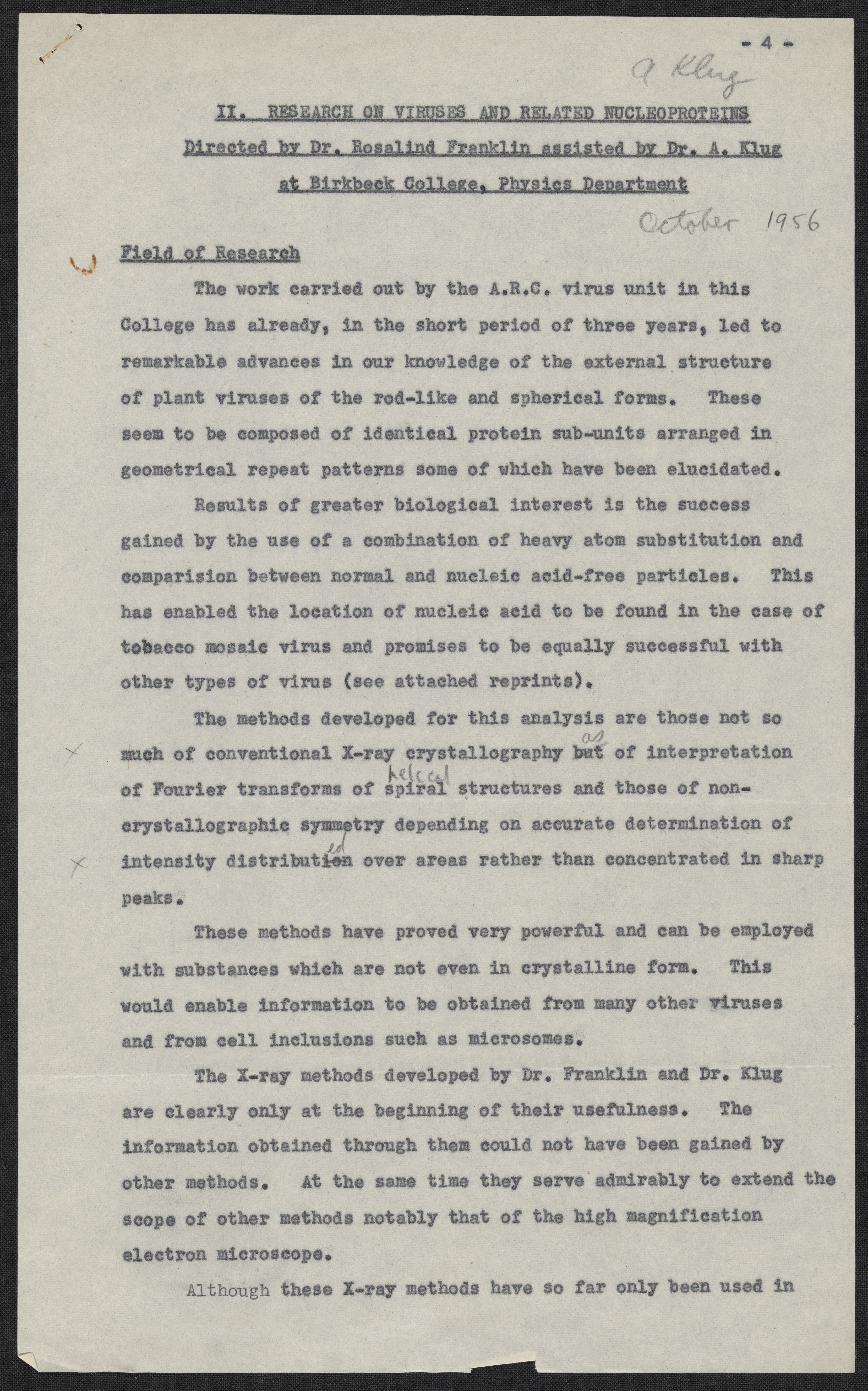 Franklin, Rosalind. “II. Research on Viruses and Related Nucleoproteins, Directed by Dr. Rosalind Franklin Assisted by Dr. A. Klug at Birkbeck College, Physics Department,” October 1956. History of Molecular Biology Collection, Box 10, Folder 10. Science History Institute. Philadelphia. https://digital.sciencehistory.org/works/b8bieh6.