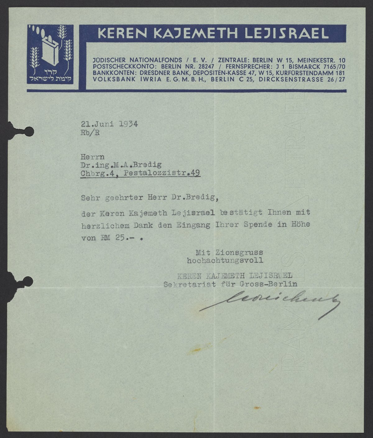 Letter from Keren Kayemeth Leisrael to Max Bredig, June 21, 1934