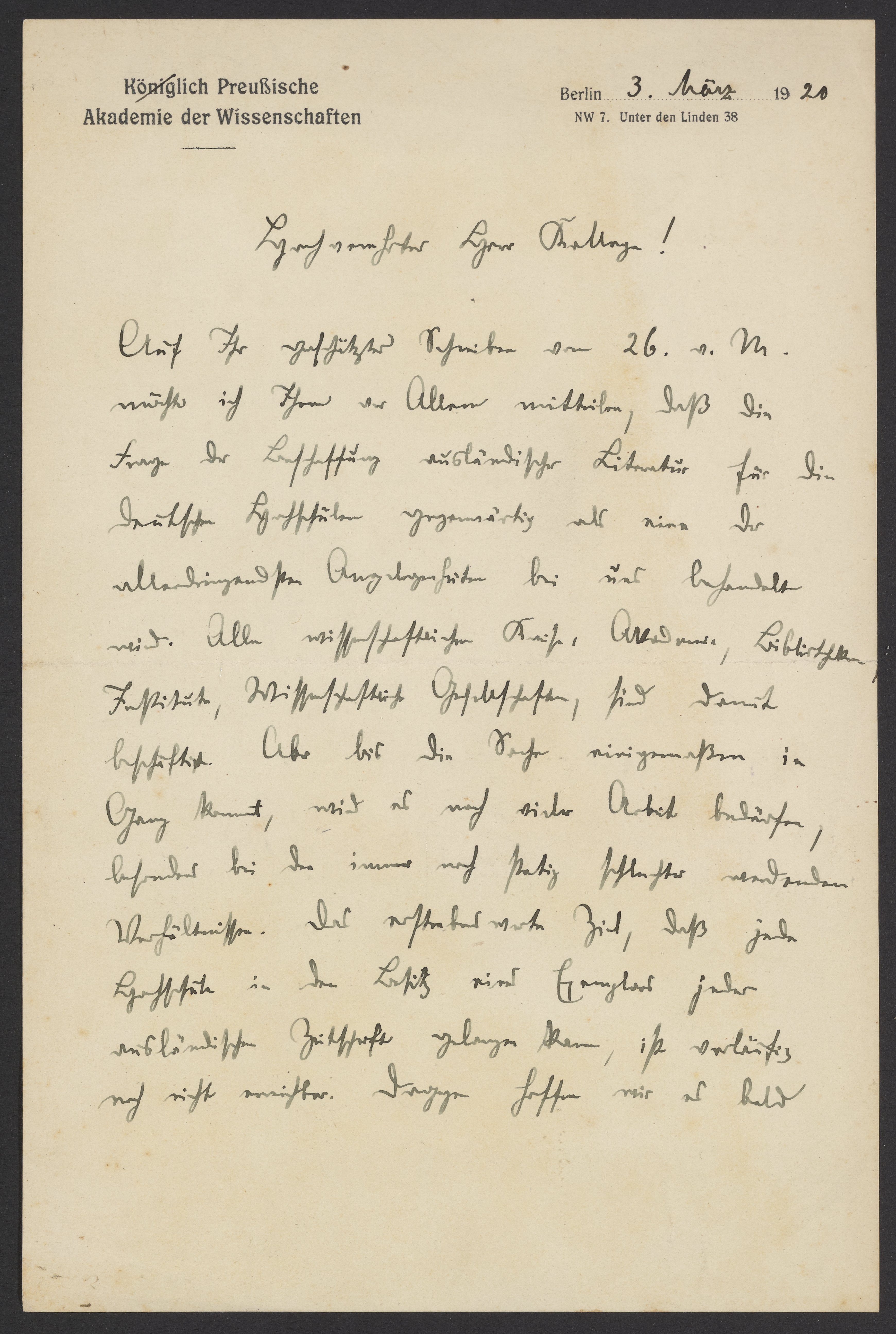 Auf Ihr geschätztes Schreiben vom 26. d.M. möchte ich Ihnen vor Allem mitteilen, daß die Frage der Beschaffung ausländischer Literatur für die deutschen Hochschulen gegenwärtig als eine der allerdringendsten Angelegenheiten bei uns behandelt wird. Alle wissenschaftlichen Berufe, Akademien, Bibliotheken, Fakultäten, Wissenschaftlichen Gesellschaften, sind damit beschäftigt. Aber bis die Sache einigermaßen in Gang kommt, wird es noch vieler Arbeit bedürfen, besonders bei den immer noch stetig schlechter werdenden Verhältnissen. Das erstrebenswerte Ziel, daß jede Hochschule in den Besitz eines Exemplars jeder ausländischen Zeitschrift gelangen kann, ist vorläufig noch nicht erreichbar. Dagegen hoffen wir es bald