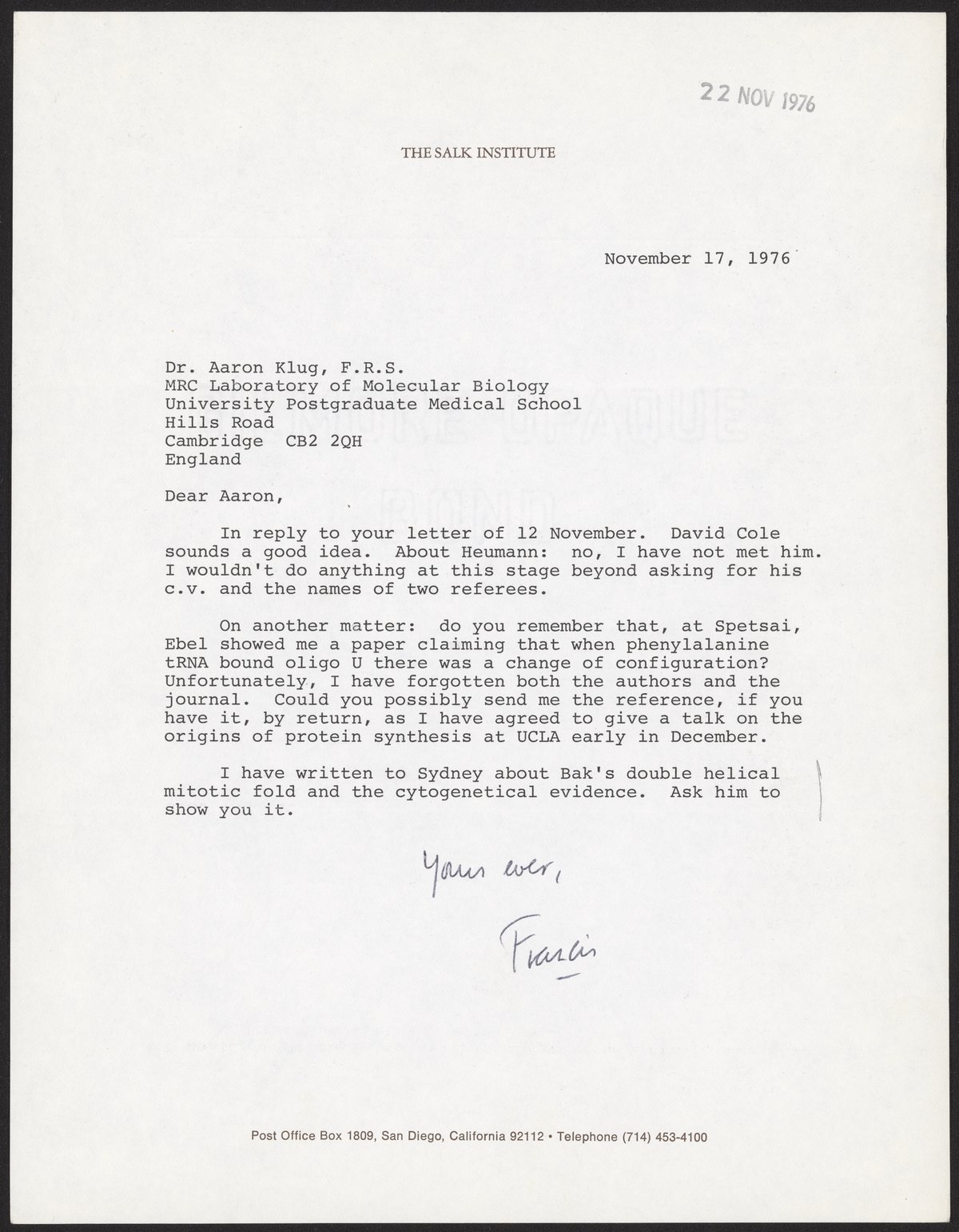 Letter from Francis Crick to Aaron Klug, November 17, 1976