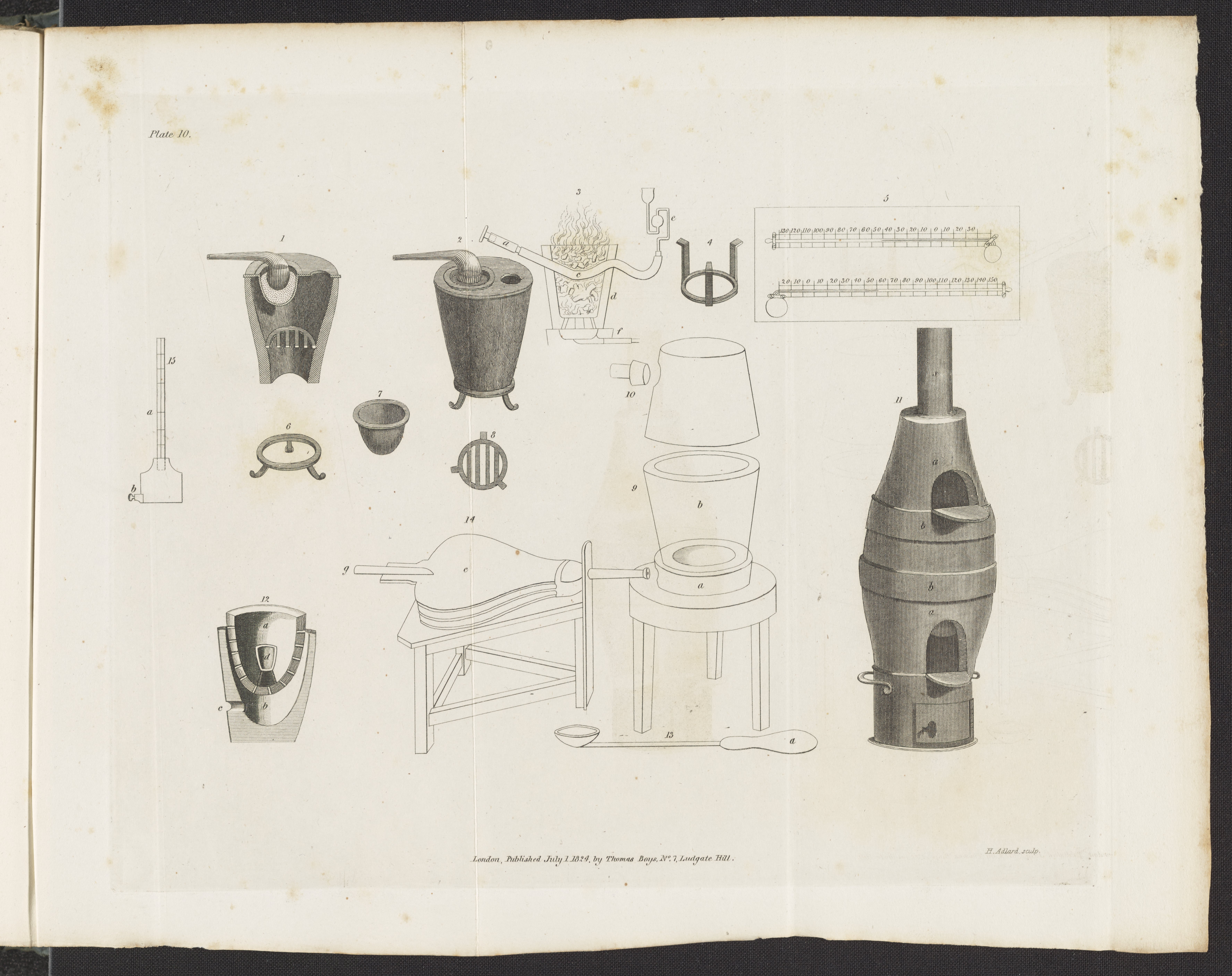 Accum, Friedrich Christian. “Plate 10: Crucible and Blast Furnaces; Alkali Decomposing Apparatus.” In An Explanatory Dictionary of the Apparatus and Instruments Employed in the Various Operations of Philosophical and Experimental Chemistry. London, England: Thomas Shotter Boys, 1824. https://digital.sciencehistory.org/works/bc386j20b.