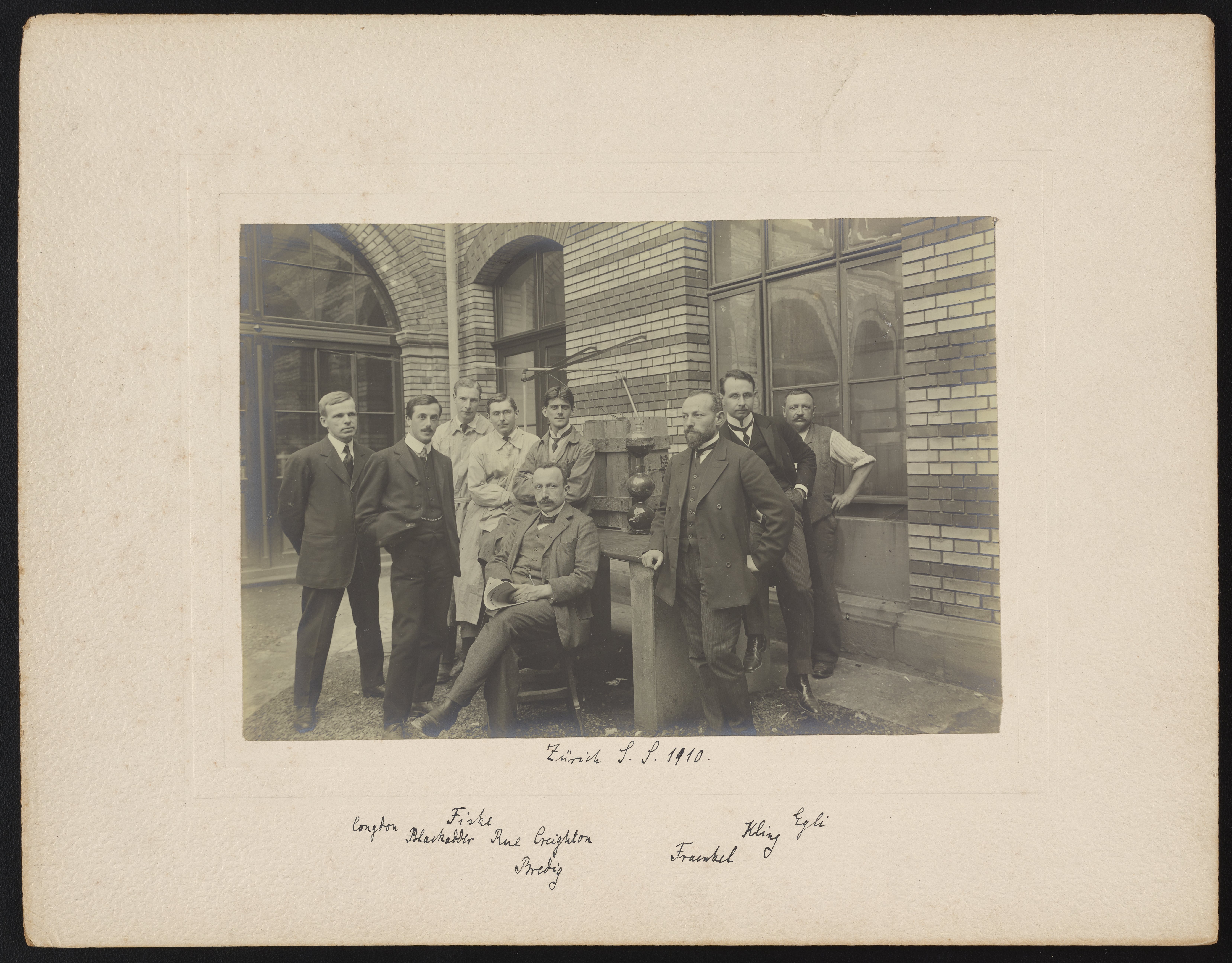Small JPG1200 x 938px — 160 KBLarge JPG2880 x 2252px — 847 KBFull-sized JPG6627 x 5182px — 4.2 MBOriginal fileTIFF — 6627 x 5182px — 98.3 MBBlack and white photograph of Georg Bredig (1868-1944) and fellow chemists at the Technische Hochschule, in Zürich, Switzerland. Bredig is seated and his colleagues are posed around him. Bredig has annotated the names of those pictured beneath the photograph. He has identified, from left to right, Edgar Davidson Congdon (1879-1970), Thomas Blackadder (1887-1953), Paul S. Fiske, "Rue", H. Jermain Creighton (1886-), Walter Fraenkel (1879-1945), "Kling", and "J. Egli."