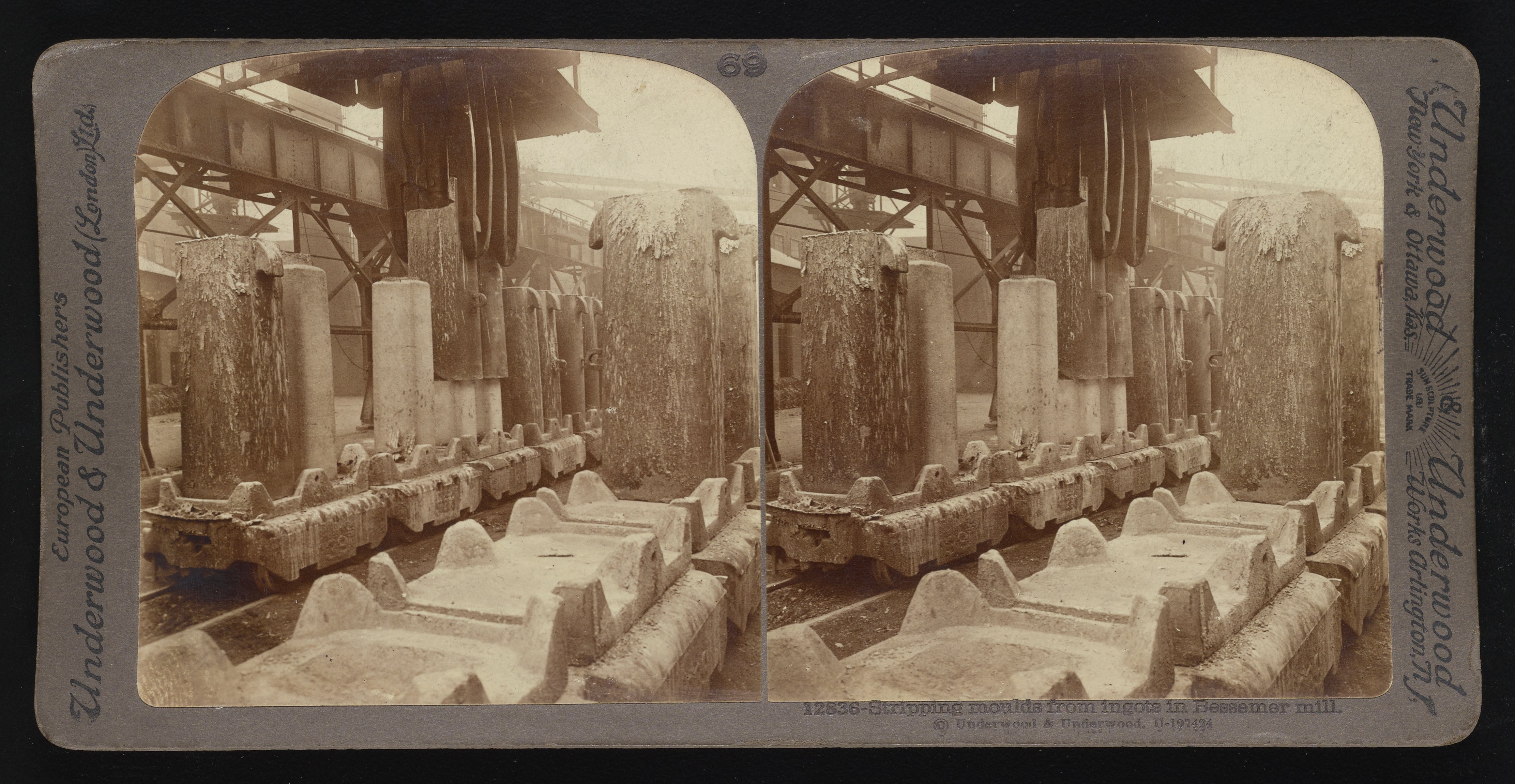 “Stripping Moulds from Ingots in Bessemer Mill.” Underwood & Underwood, n.d. Underwood & Underwood Stereographs of Manufacturing Industries. Science History Institute. Philadelphia. https://digital.sciencehistory.org/works/bg257f05g.