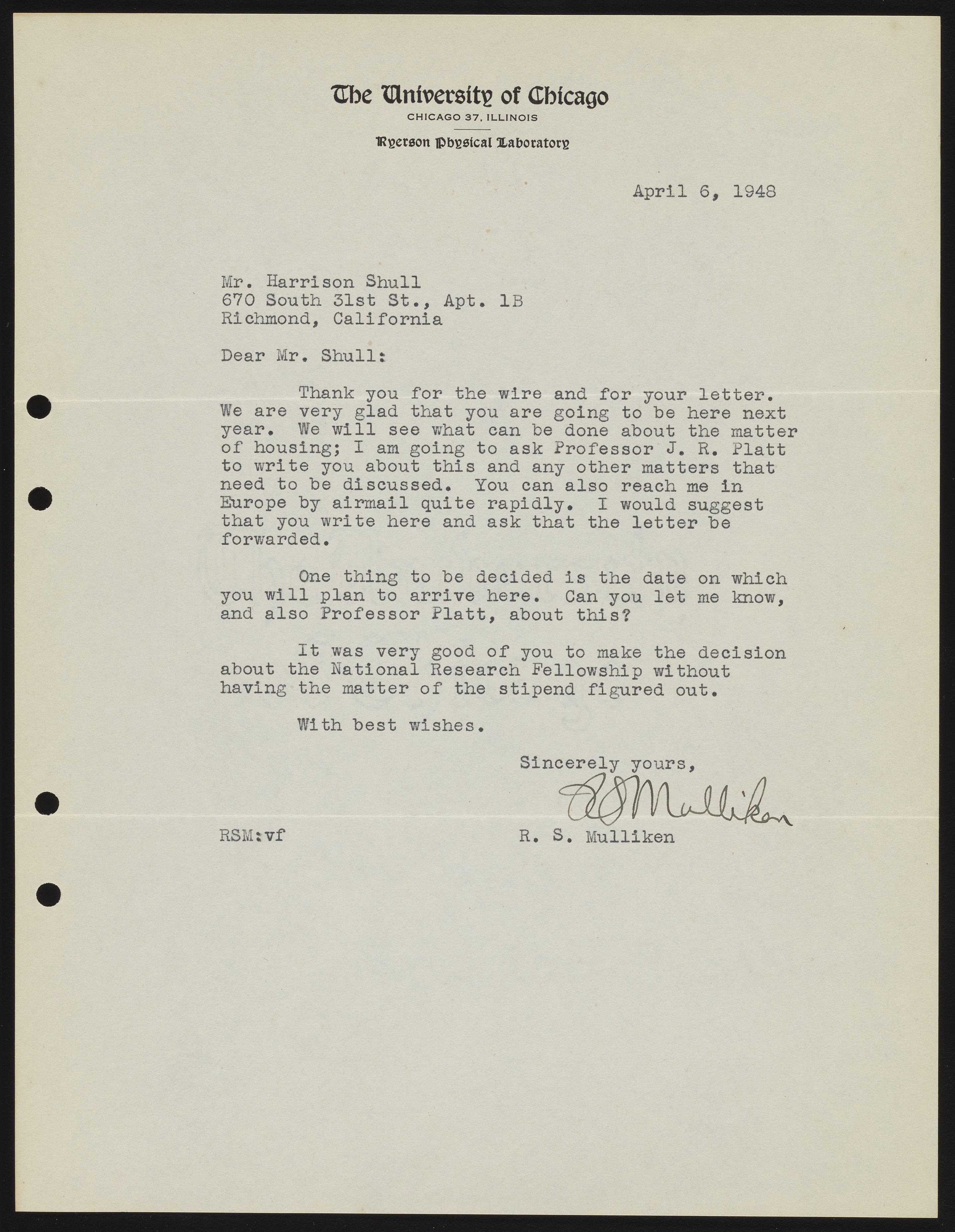 Mulliken, Robert Sanderson. “Letter from Robert S. Mulliken to Harrison Shull, 1948,” April 6, 1948. Robert S. Mulliken & Harrison Shull Correspondence, Box 1. Science History Institute. Philadelphia. https://digital.sciencehistory.org/works/bg257f160.
