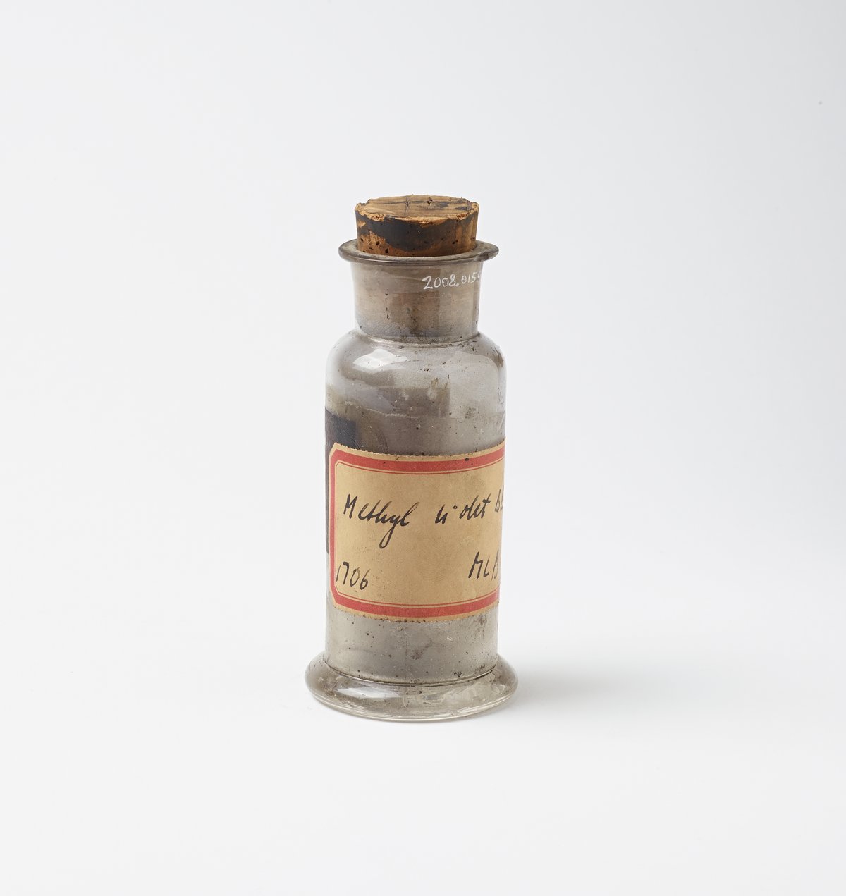 Round glass bottle with cork stopper; label attached to front identifies manufacturer and contents (label has been waxed over).