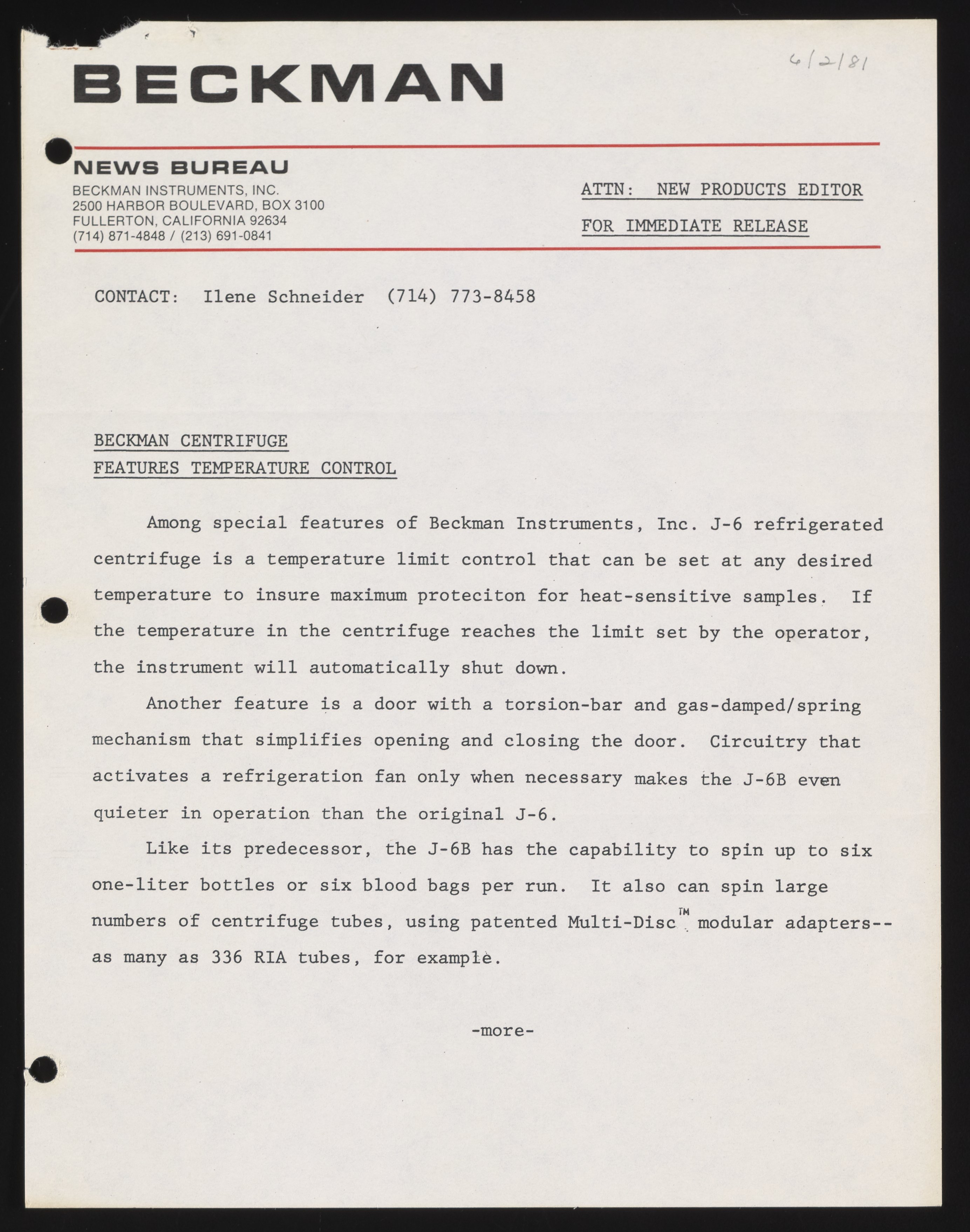 Schneider, Ilene. “Beckman Centrifuge Features Temperature Control,” June 2, 1981. Beckman Historical Collection, Box 58, Folder 69. Science History Institute. Philadelphia. https://digital.sciencehistory.org/works/bg257f59s.