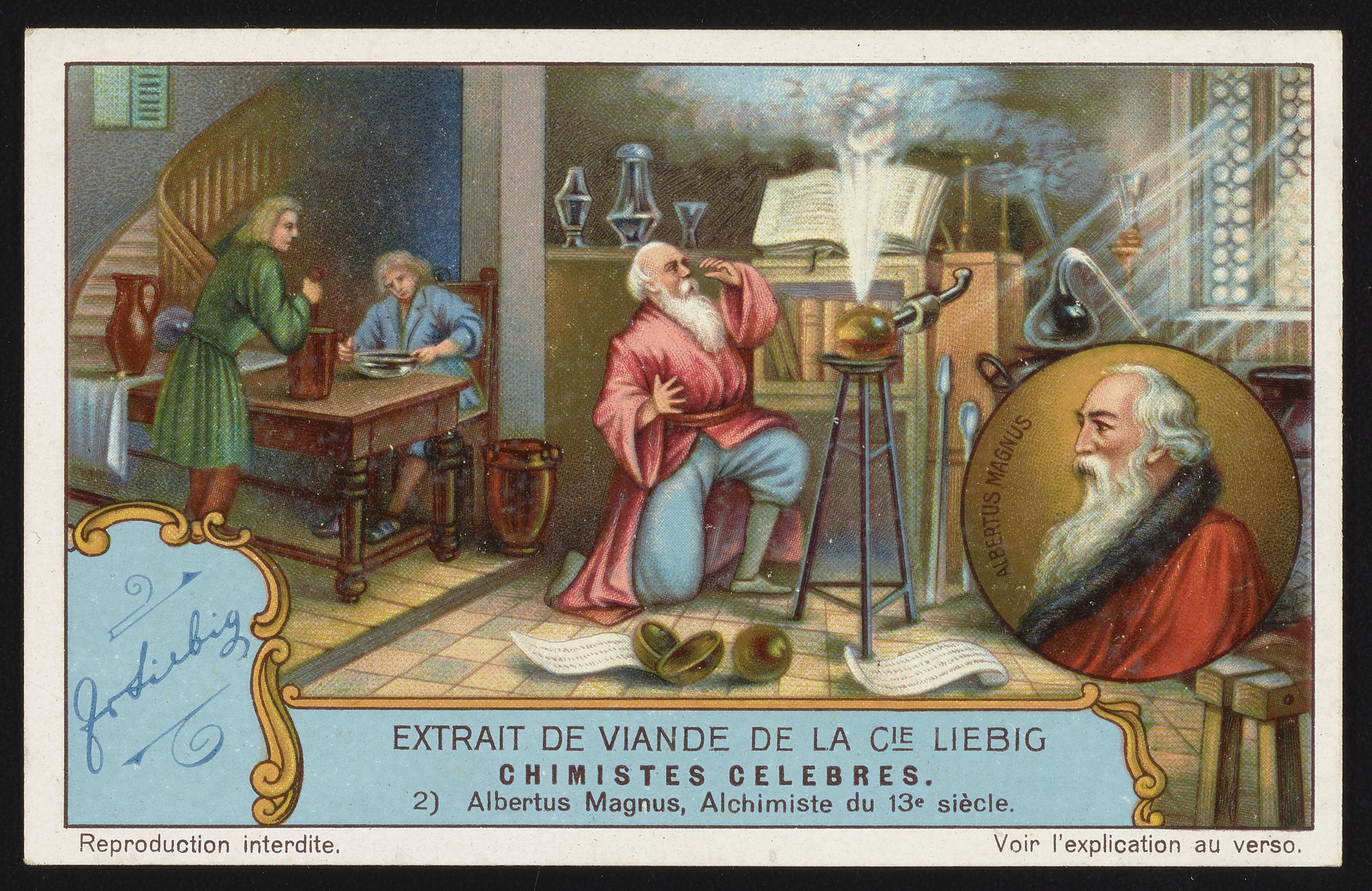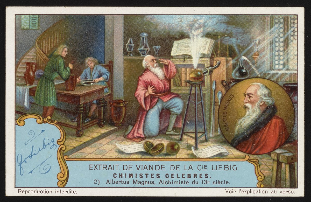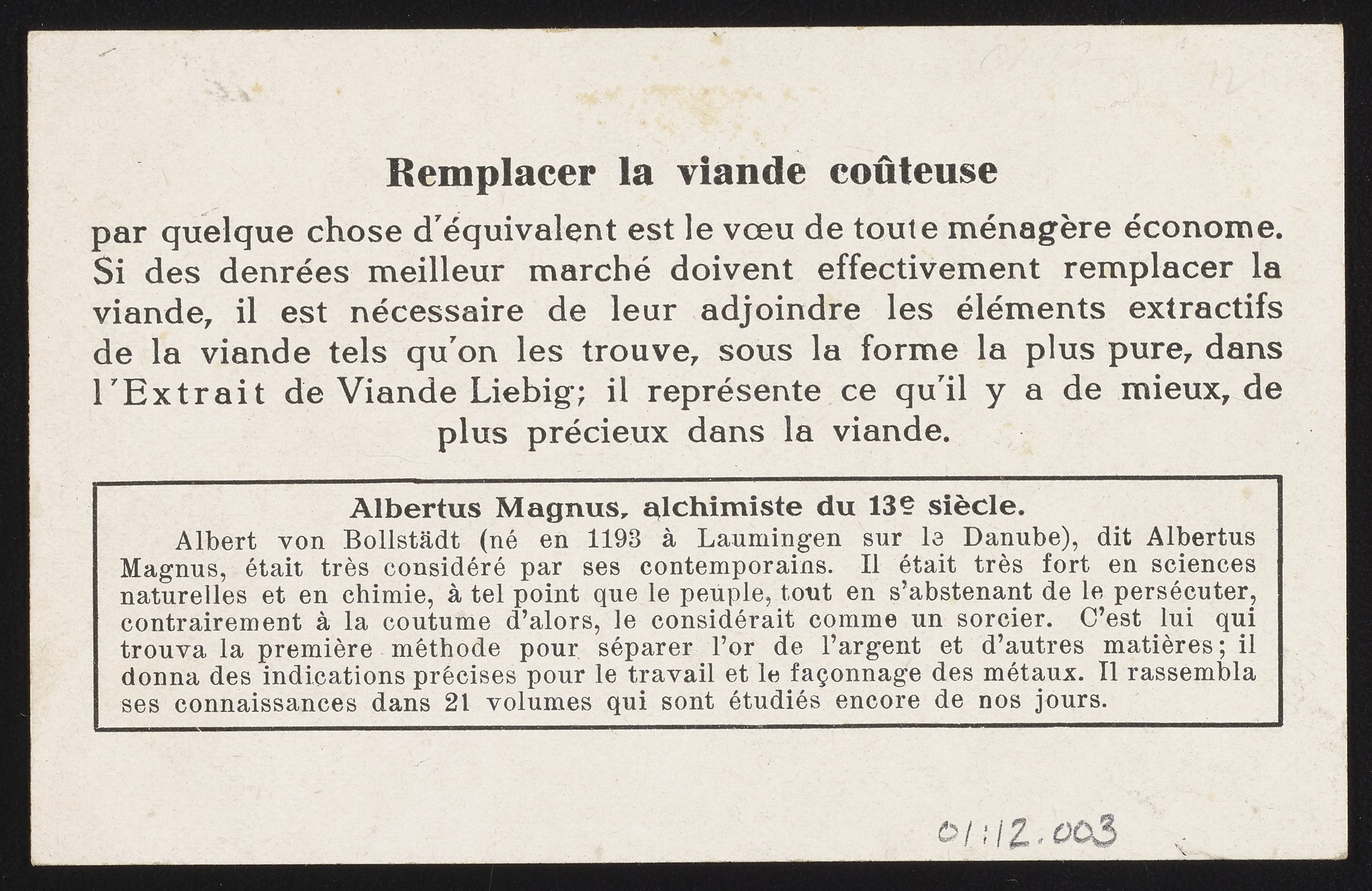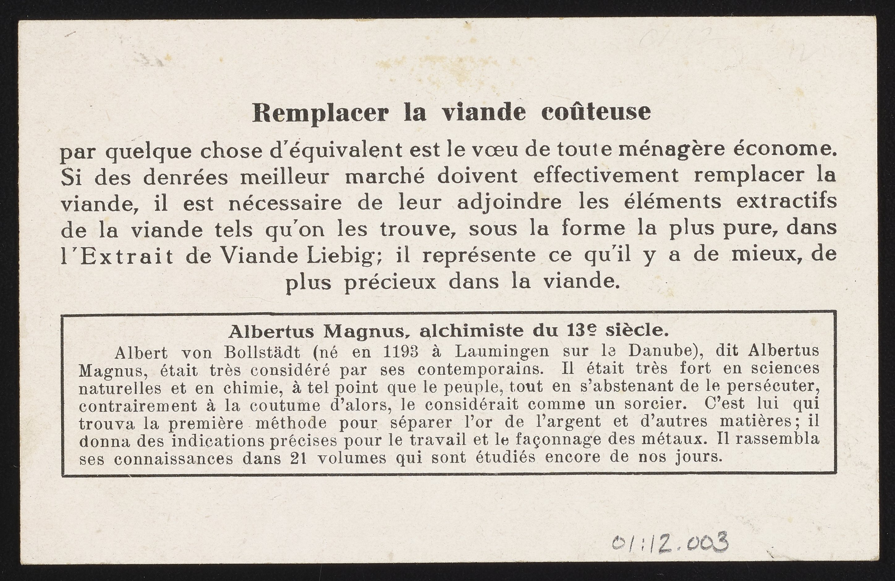 Trade card for Extrait de Viande de la Cie Liebig [Liebig Meat Extract Company] with Albertus Magnus