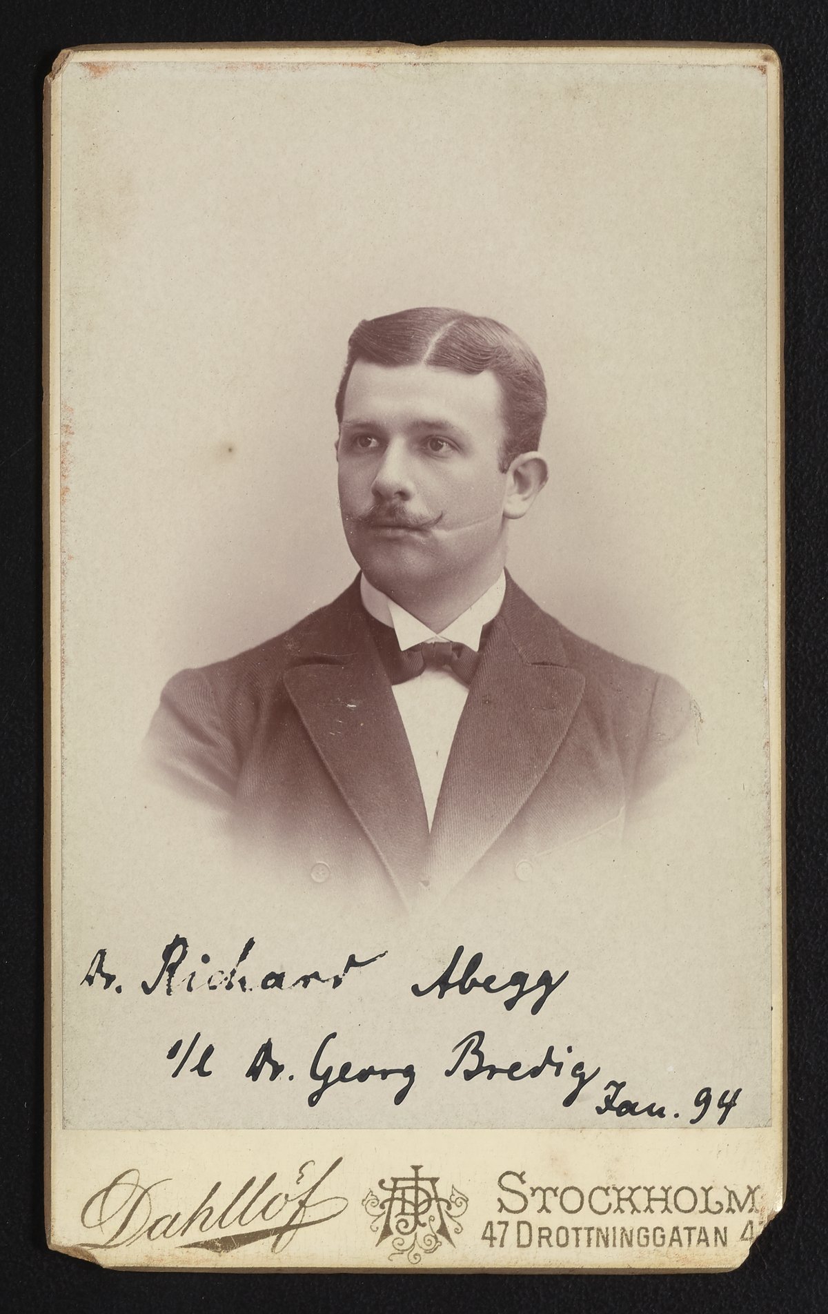 Small JPG1200 x 1904px — 304 KBFull-sized JPG1790 x 2840px — 597 KBOriginal fileTIFF — 1790 x 2840px — 14.6 MBPortrait of Richard Abegg (1869-1910), taken at Dahllöf Studio, Stockholm. Abegg was a German physical chemist known for his work in valence theory which led to the later octet rule. At the time this letter was written, Abegg was the Editor of the Zeitschrift für Elektrochemie, a German Journal of Electrochemistry.
