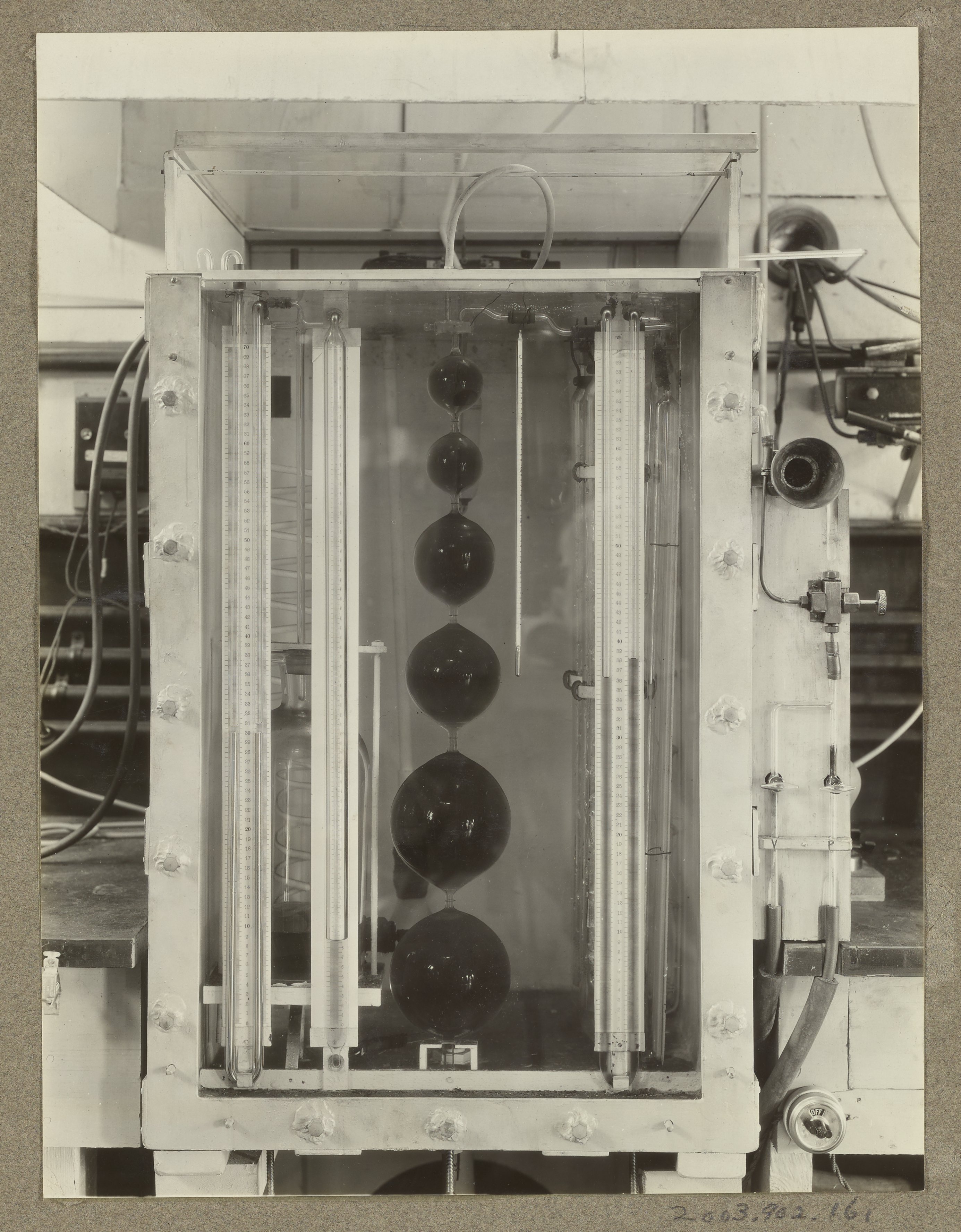 General view of a thermostat and equipment used to determine the compressibility of gas at the U.S. Department of Agriculture's Fixed Nitrogen Research Laboratory located in Washington, D.C. In chemistry, compressibility refers to the measure of how much a given volume of matter decreases when placed under pressure. At the Fixed Nitrogen Research Laboratory, this particular apparatus was used to measure the amount of gas present after expansion from a high-pressure environment.