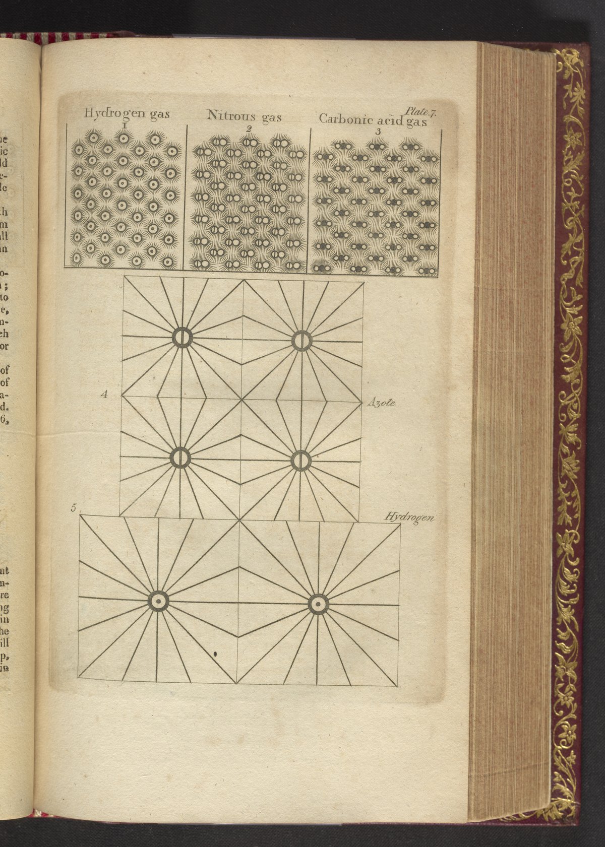 Dalton, John. “Plate 7: Arrangements of Elastic Fluid Particles.” In A New System of Chemical Philosophy. Manchester, England: Russell & Allen, 1810. https://digital.sciencehistory.org/works/bk128b680.