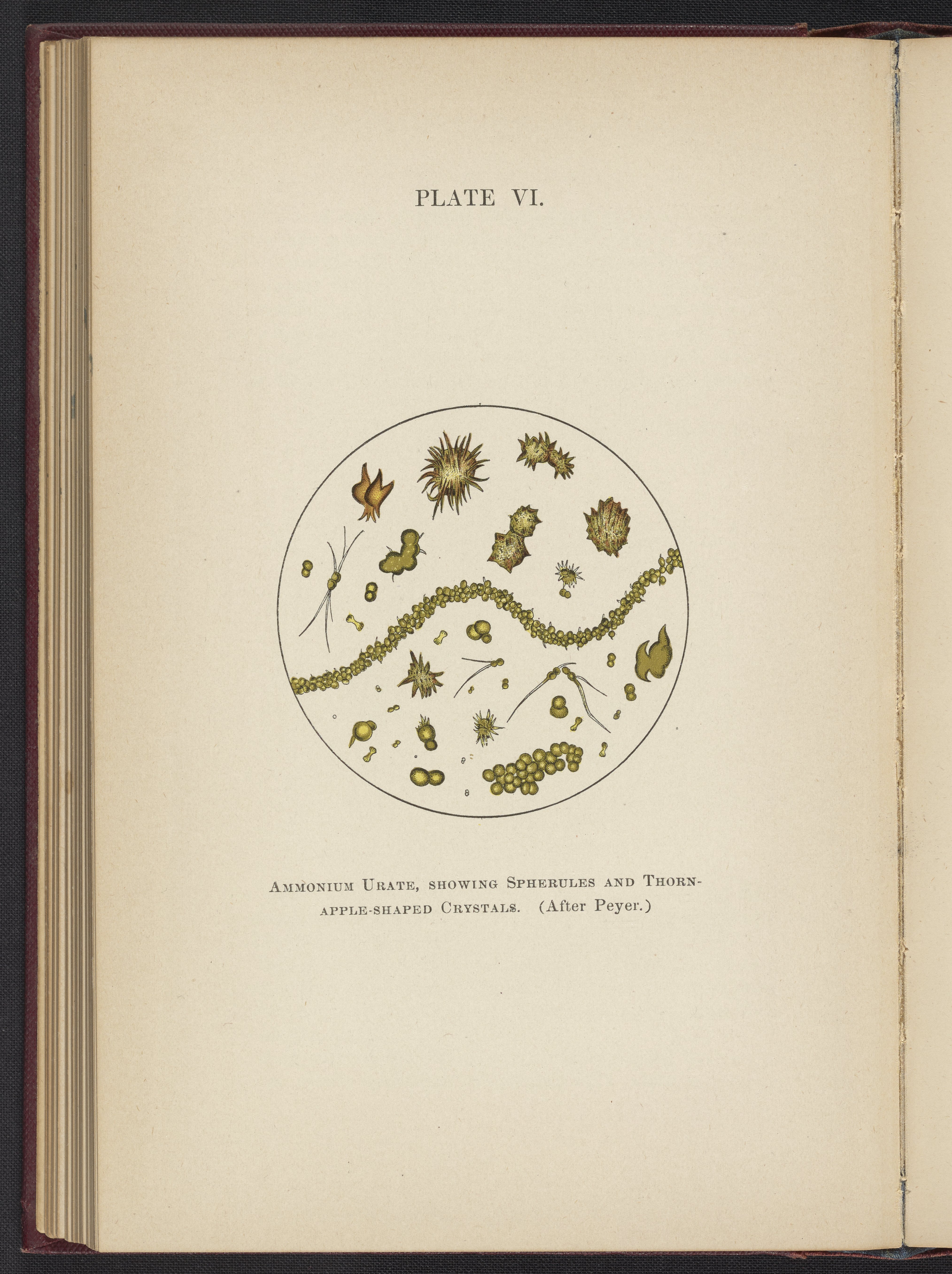 “Plate VI: Ammonium Urate, Showing Spherules and Thorn-Apple-Shaped Crystals.” Practical Uranalysis and Urinary Diagnosis, 1898. https://digital.sciencehistory.org/works/bk128b84c.