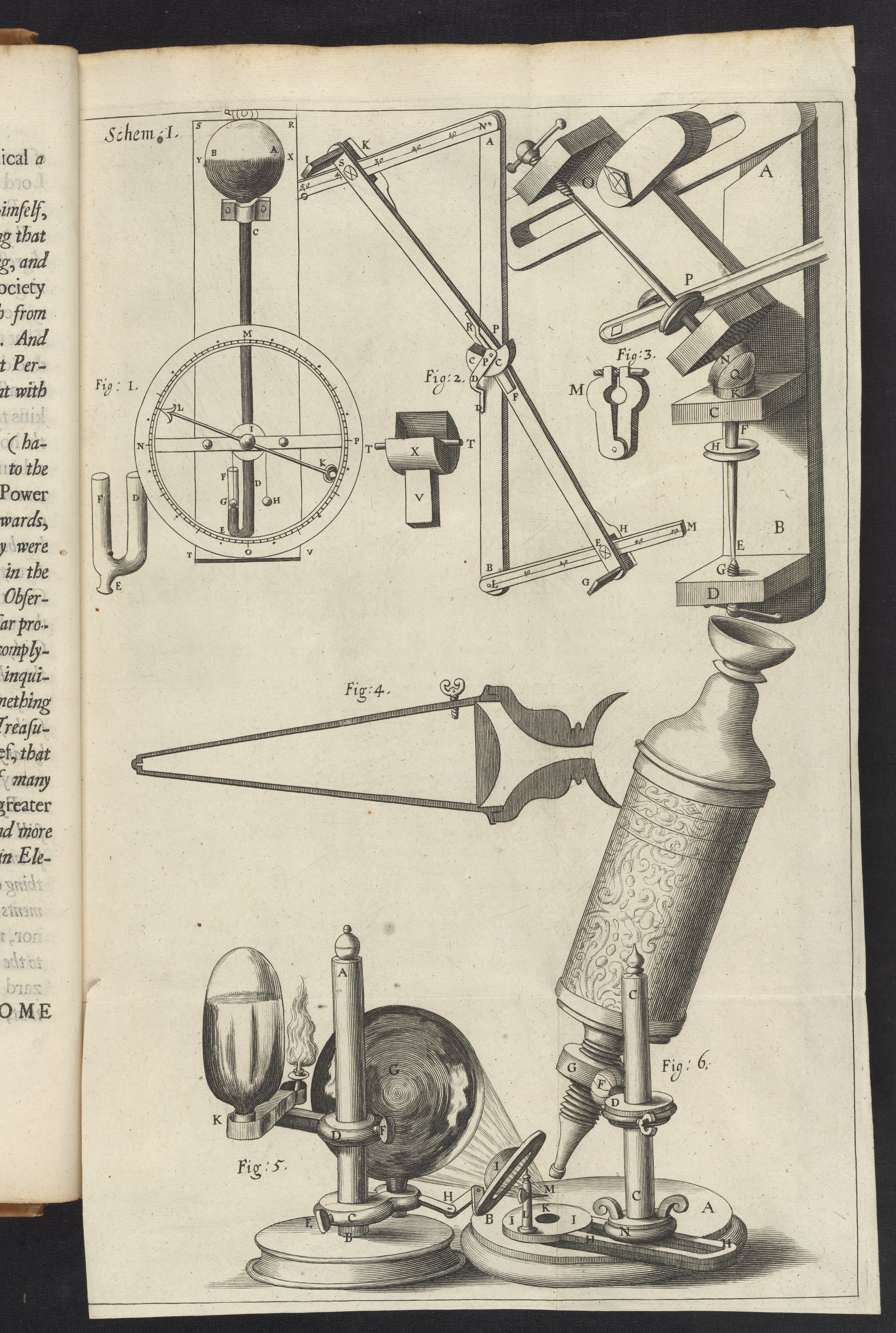 Engravings from Schem. 1 of the first edition of Robert Hooke's seminal volume, Micrographia : or, Some physiological descriptions of minute bodies made by magnifying glasses. With observations and inquiries thereupon. The engravings depict a microscope (Figure 6) and assorted optical instruments and devices used by Hooke, as described in the preface of the volume.