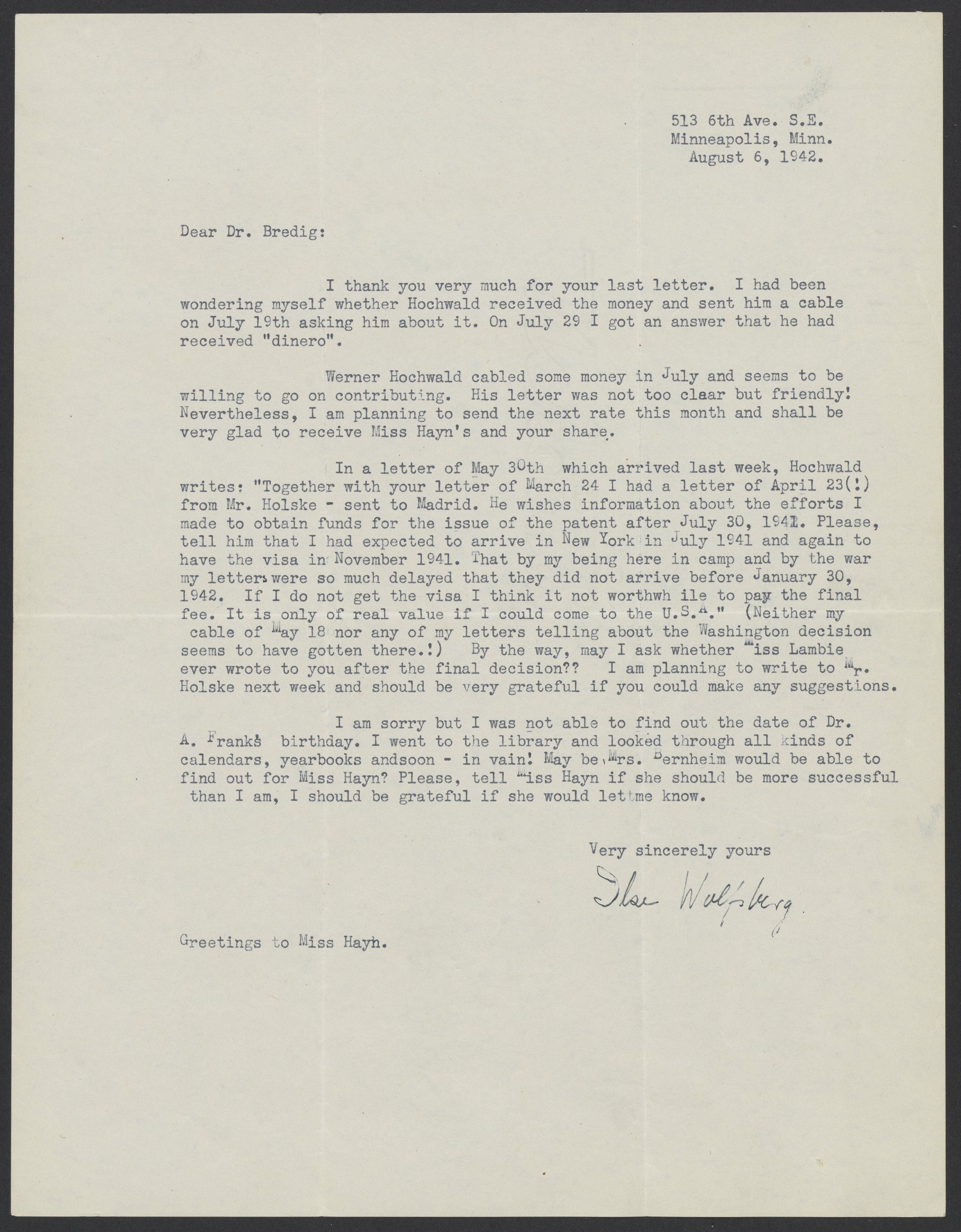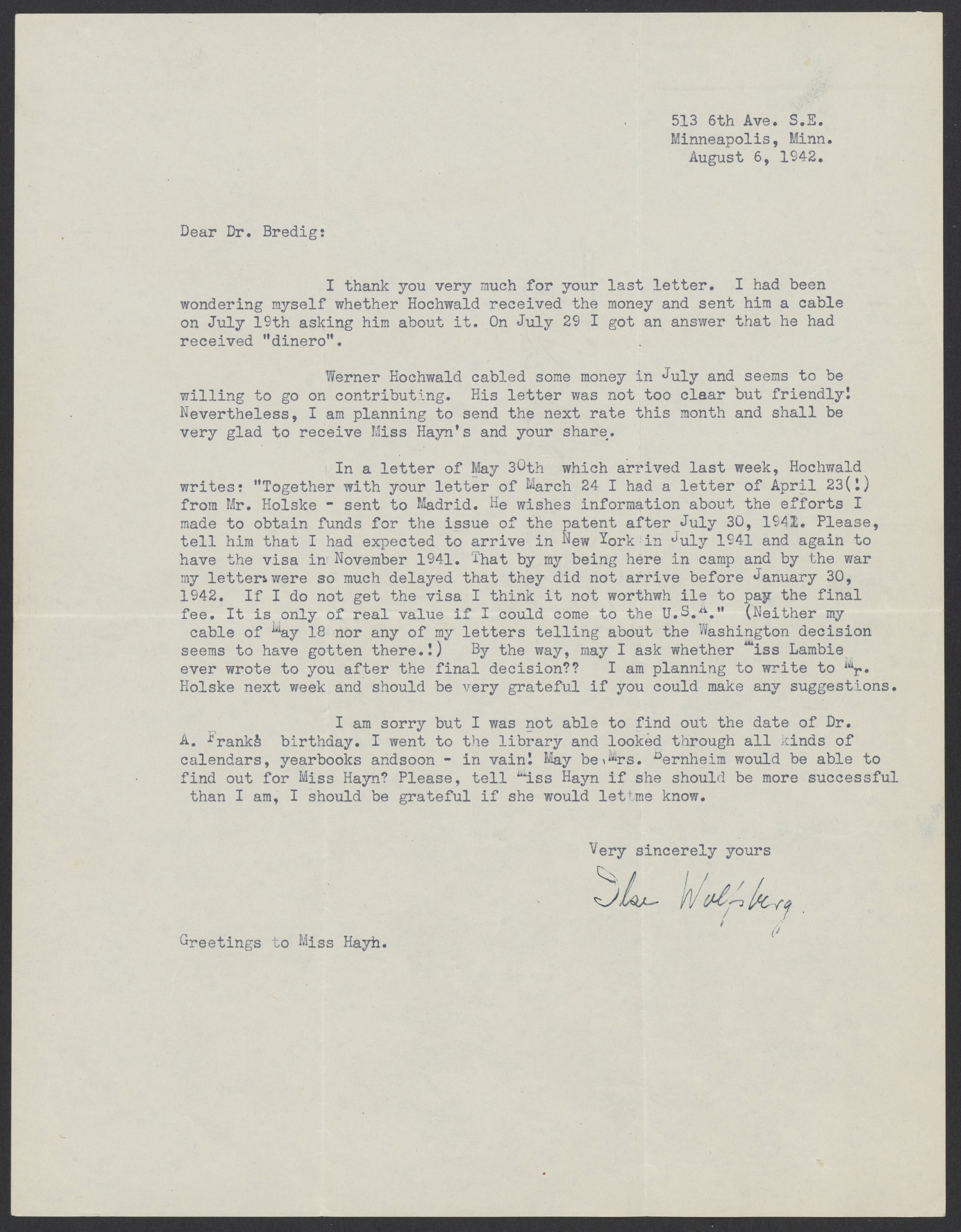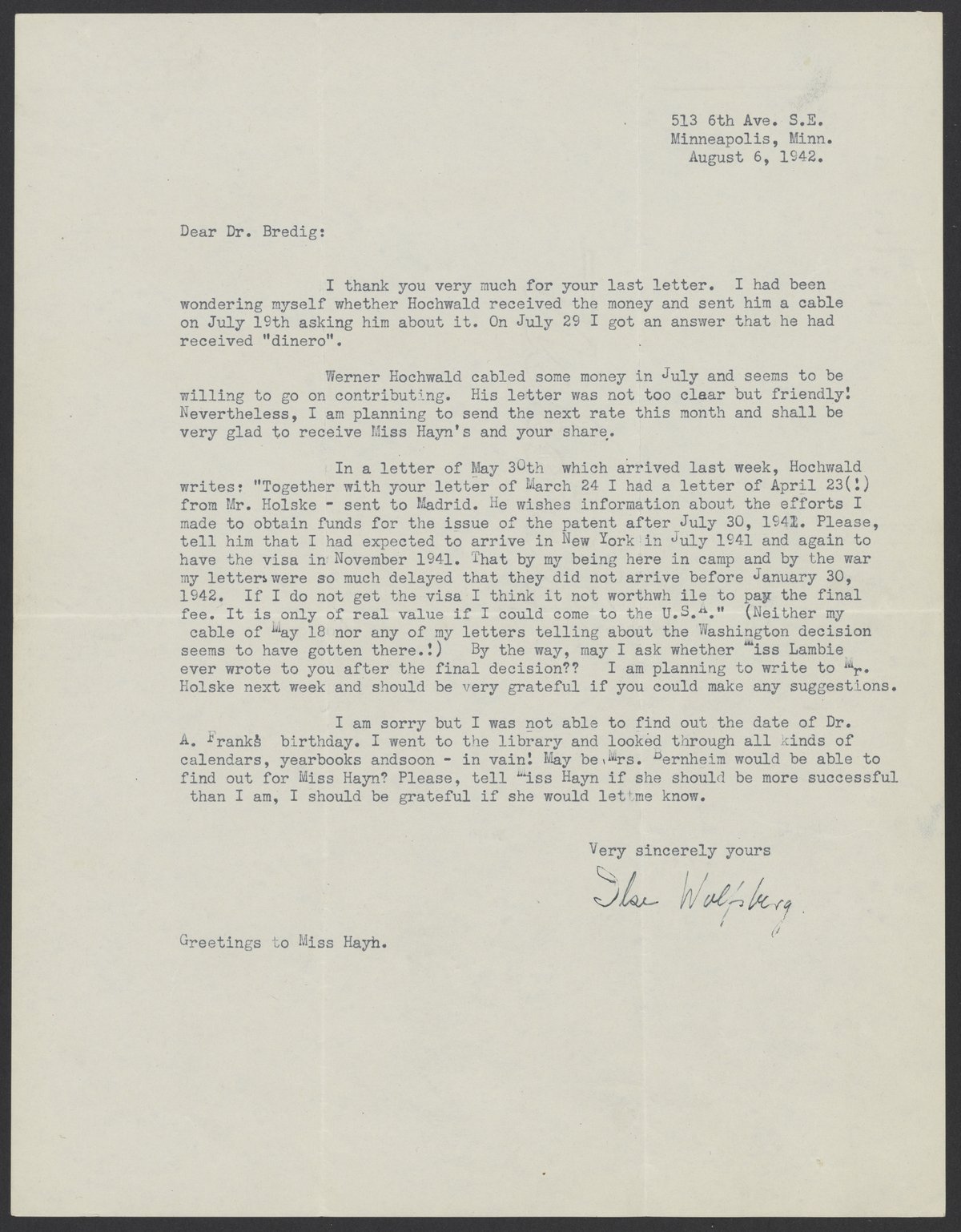 Ilse Wolfsberg writes to Max Bredig (1902-1977) about sending money to Fritz Hochwald (1897-1968), who is in an internment camp in Spain. She also relays a message Hochwald sent her a few months earlier.