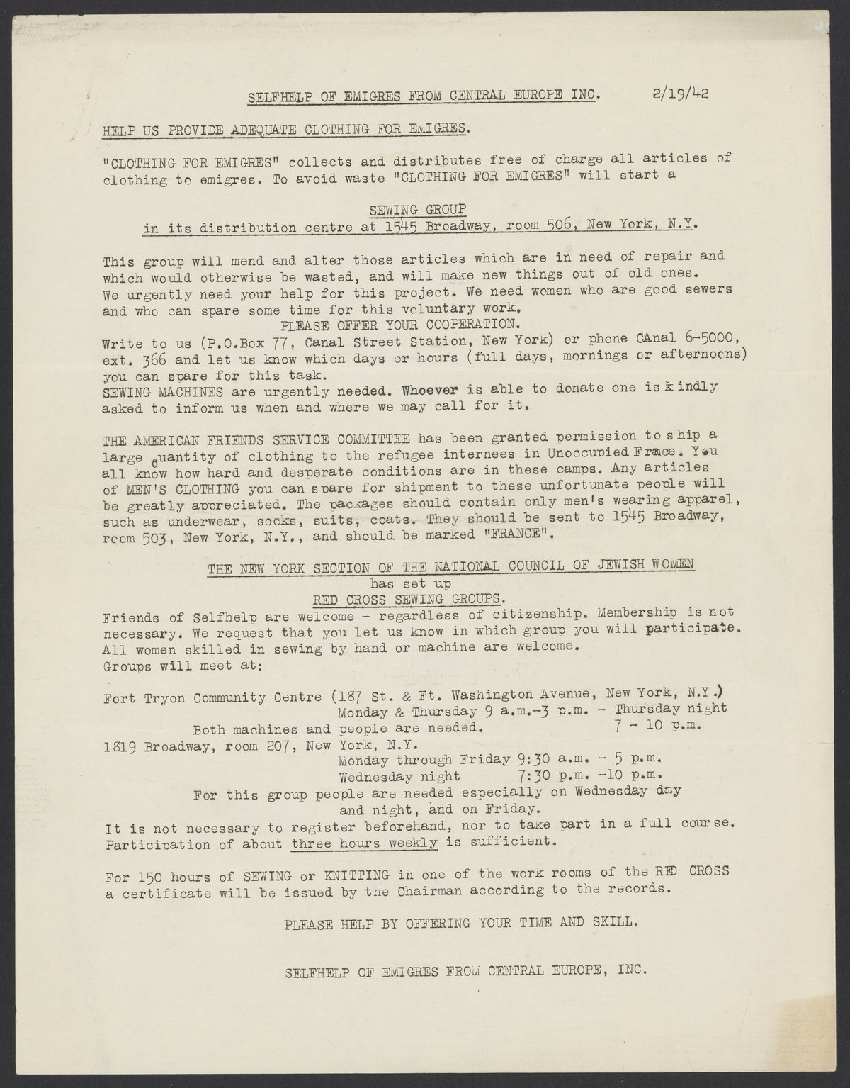Small JPG1200 x 1535px — 313 KBLarge JPG2880 x 3682px — 1.6 MBFull-sized JPG5369 x 6865px — 5.4 MBOriginal fileTIFF — 5369 x 6865px — 106 MBSelfhelp of Emigres from Central Europe, Inc. was founded in 1936 by German Jews in New York to support new immigrants fleeing persecution in Nazi-occupied Europe. Today, the foundation still exists as Selfhelp Community Services. This February 1942 newsletter contains a call for participation in sewing groups, as many incoming refugees are in need of clothing.