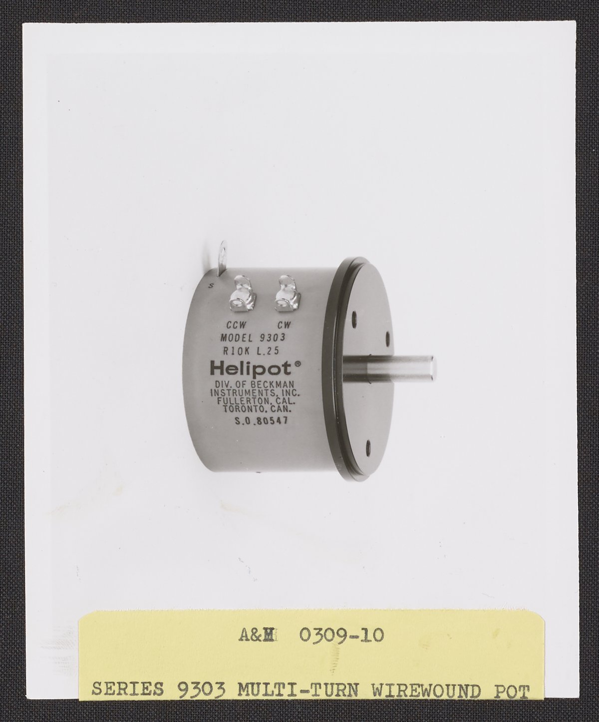 Armstrong & Hess. “Helipot Model 9303 Multi-Turn Wirewound Potentiometer,” 1950–1969. Beckman Historical Collection, Box 85. Science History Institute. Philadelphia. https://digital.sciencehistory.org/works/bn9997234.