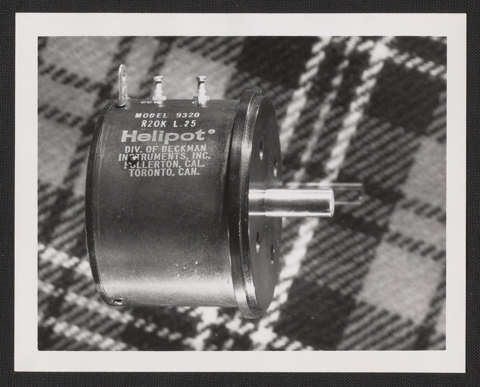 Armstrong & Hess. “Helipot Model 9320 Potentiometer with Tartan Backdrop,” 1950–1969. Beckman Historical Collection, Box 86. Science History Institute. Philadelphia. https://digital.sciencehistory.org/works/bn999724d.