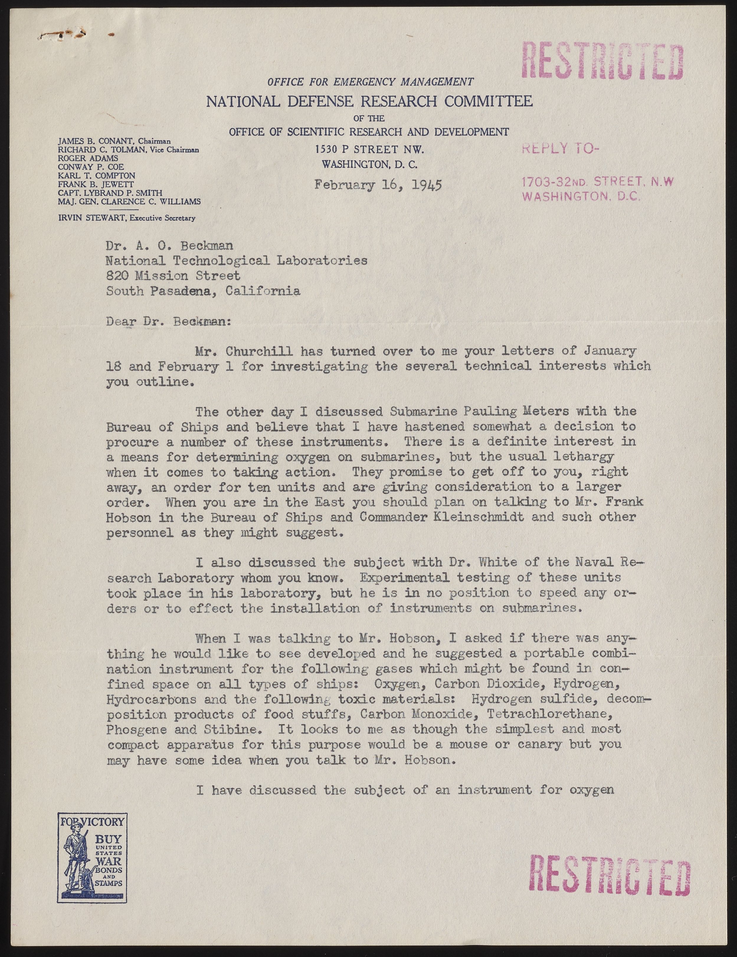 Small JPG1200 x 1559px — 354 KBFull-sized JPG2498 x 3246px — 1.3 MBOriginal fileTIFF — 2498 x 3246px — 23.3 MBThe letter regards the procurement of Pauling meters for use on submarines and issues of cost and portability.