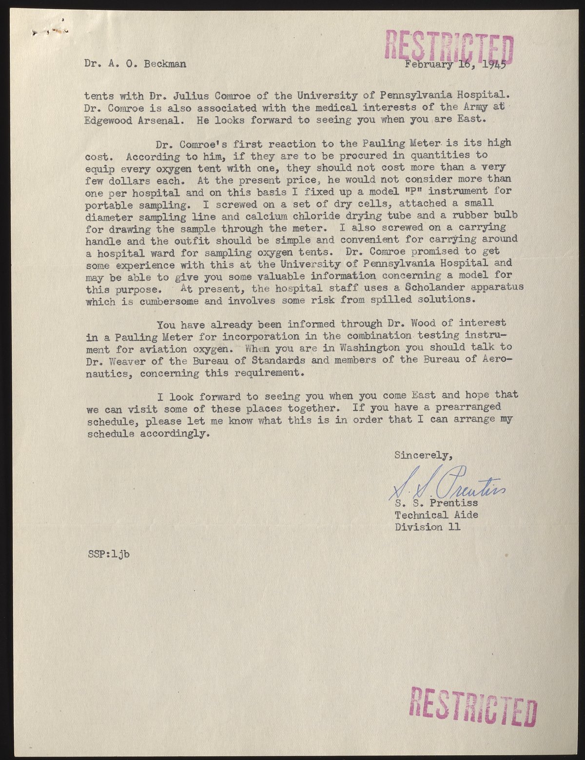 Prentiss, Spencer S. “Letter from S. S. Prentiss to Arnold O. Beckman,” February 16, 1945. Beckman Historical Collection, Box 19, Folder 9. Science History Institute. Philadelphia. https://digital.sciencehistory.org/works/br86b361k.