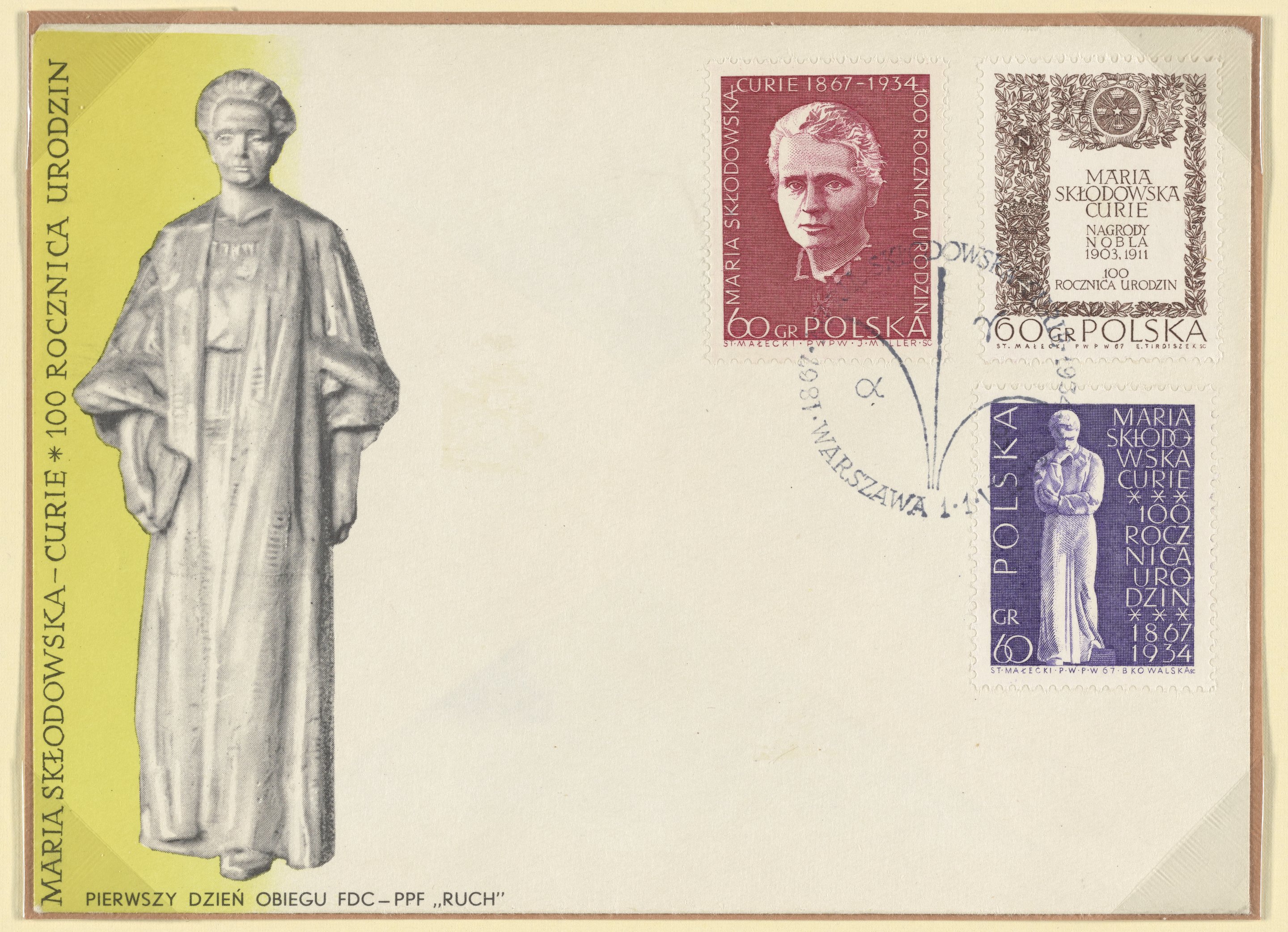 “First Day Cover and Polish Postage Stamps Commemorating the 100th Anniversary of the Birth of Marie Curie.” Poland, circa 1967. Witco Stamp Collection, Box 2. Science History Institute. Philadelphia. https://digital.sciencehistory.org/works/br86b366z.