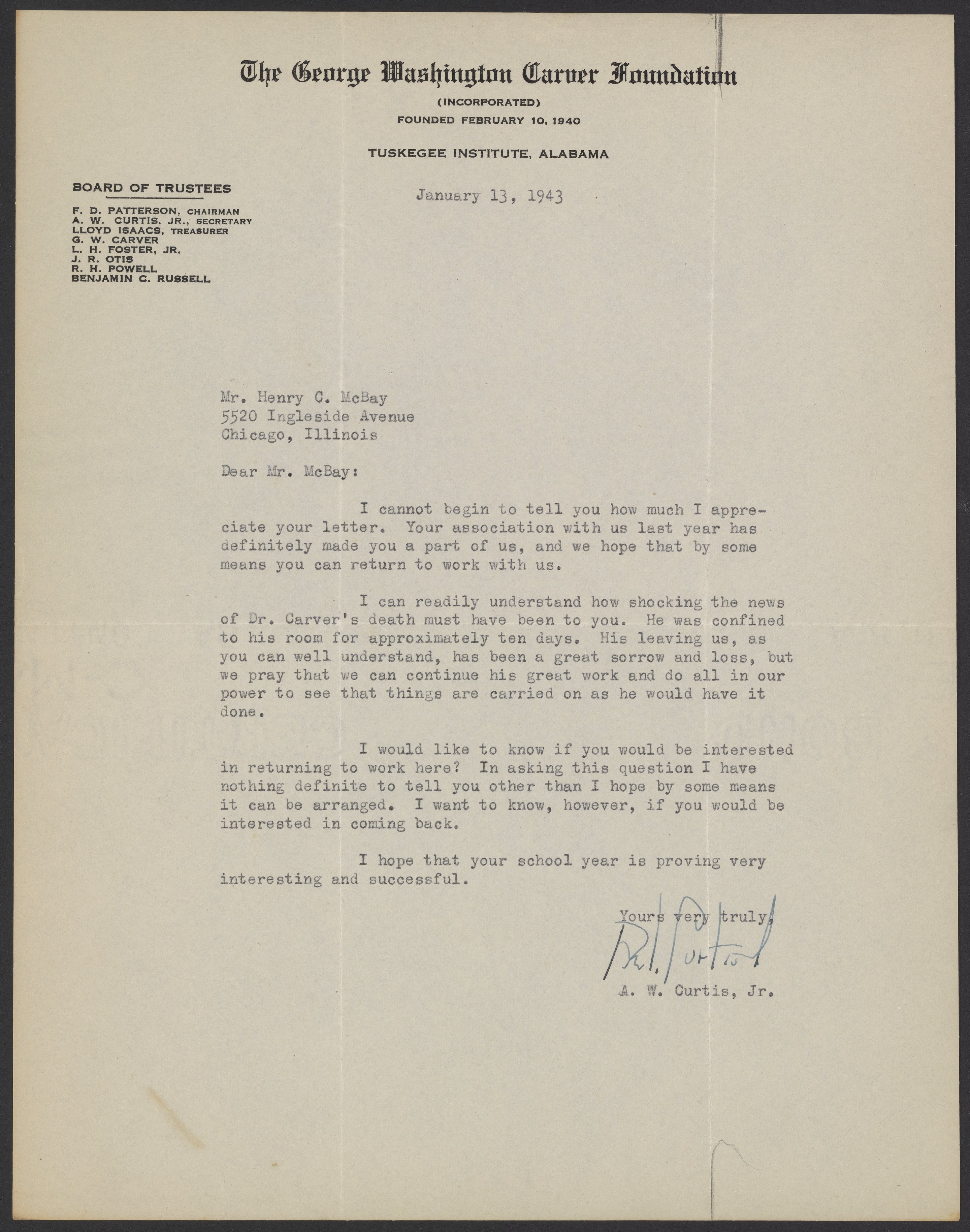 Austin Wingate Curtis (1911–2004), an accomplished chemist known for his work with George Washington Carver (early 1860s-1943), writes to Henry McBay (1914-1995). Curtis thanks McBay for his previous correspondence and shares his sorrow for the recent passing of Carver. Curtis inquires whether McBay would be interested in continuing to collaborate with their lab at the Tuskegee Institute.