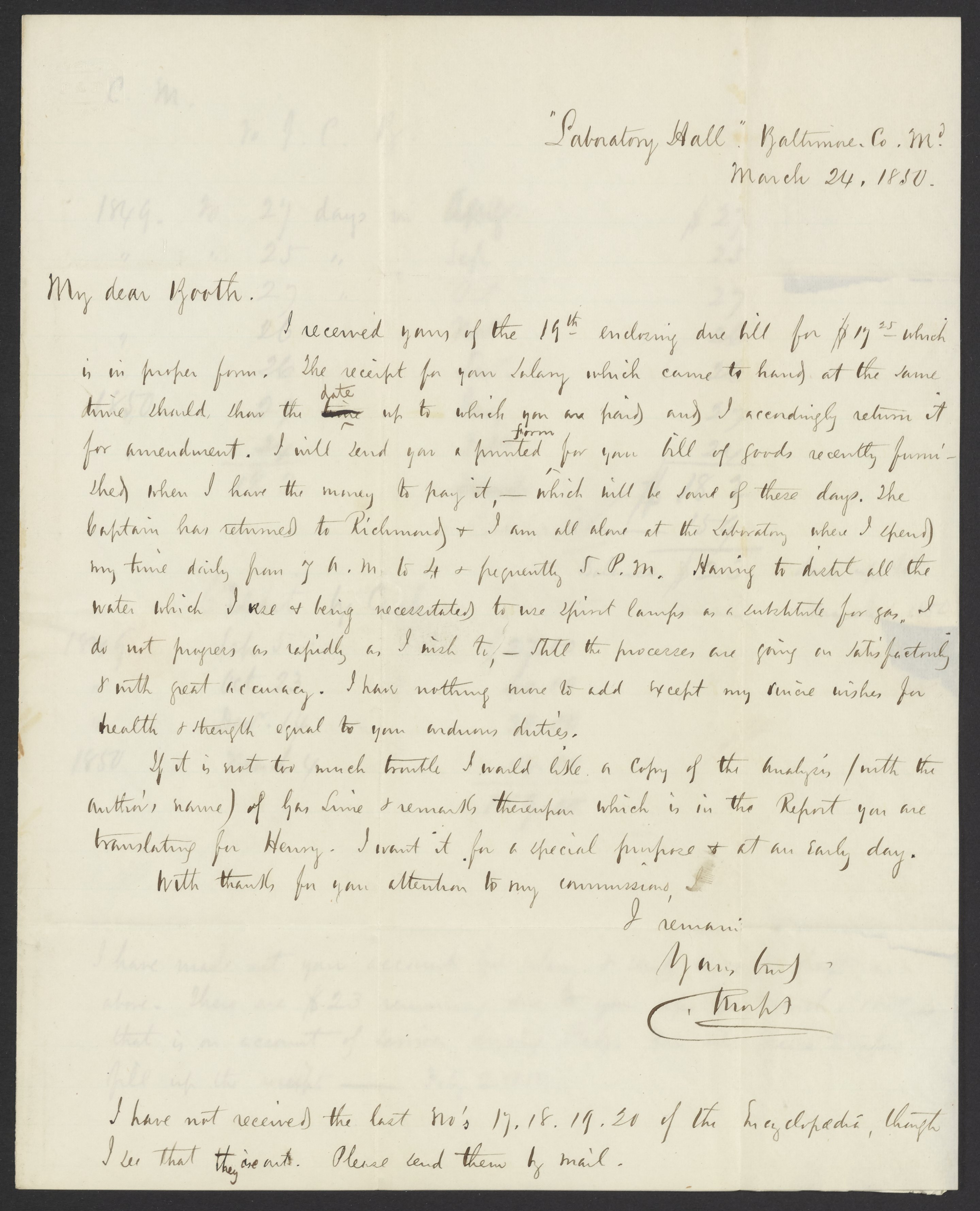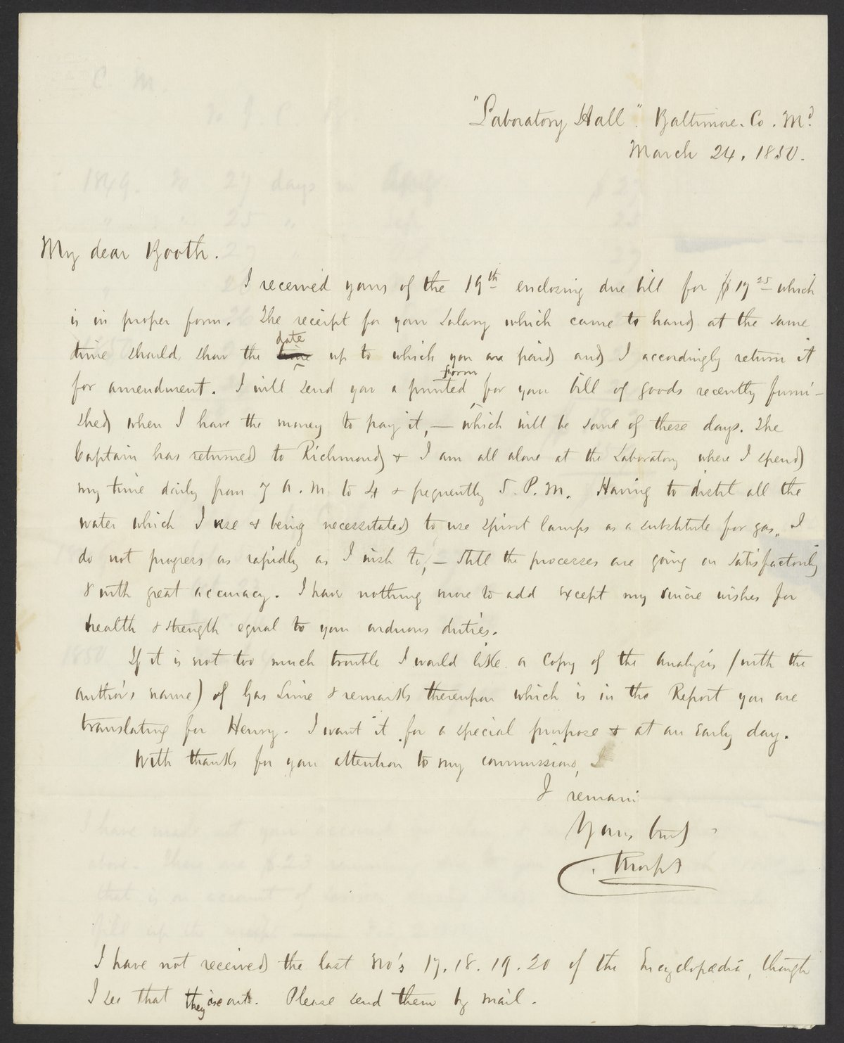 Morfit, Campbell. “Letter from Campbell Morfit to James Curtis Booth, March 24, 1850,” March 24, 1850. Papers of James Curtis Booth, Box 1, Folder 10. Science History Institute. Philadelphia. https://digital.sciencehistory.org/works/bv29kj7.