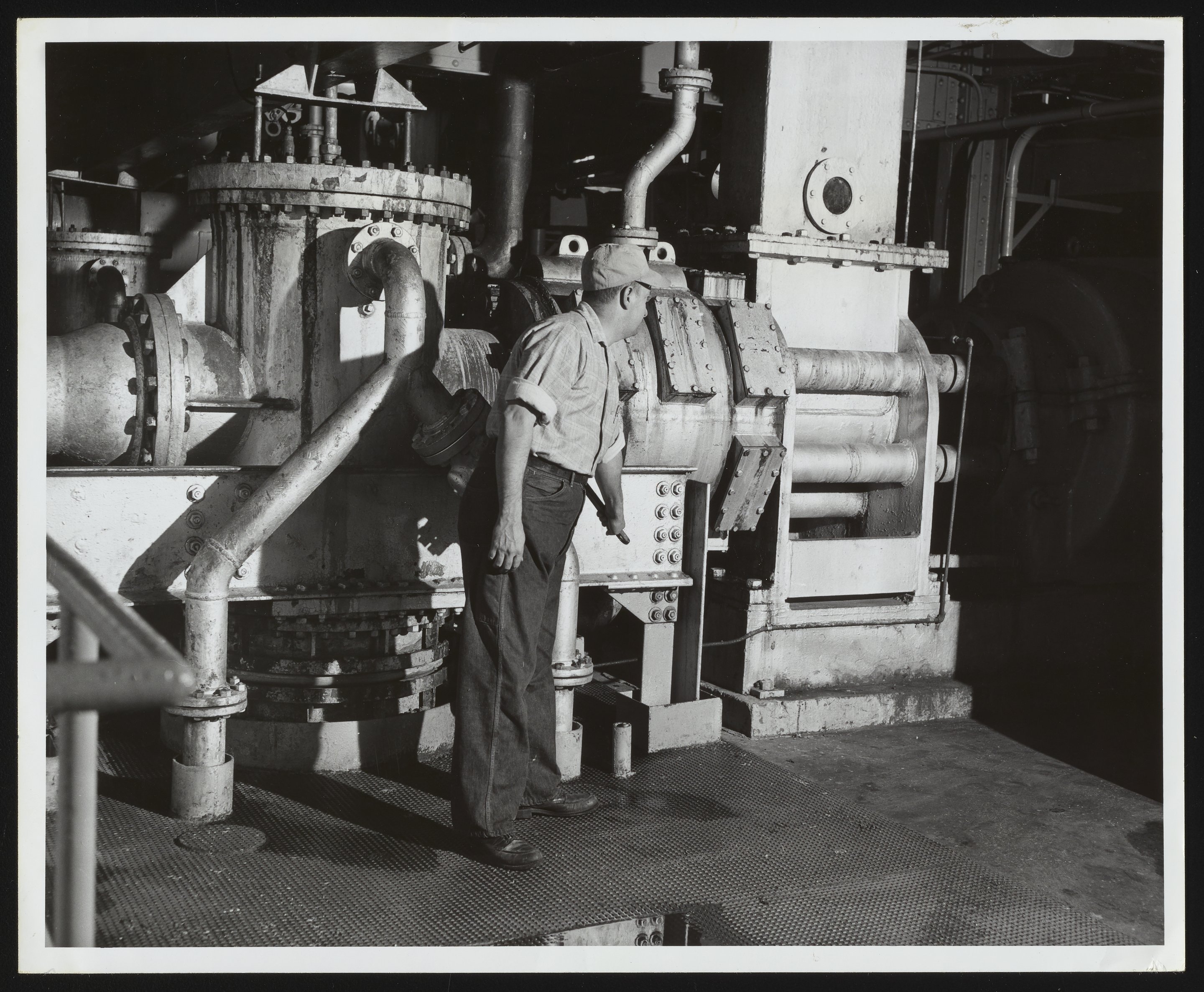 General view of the charging end of a continuous digester used at the Hercules Powder Company plant in Hopewell, Virginia. The continuous digester system was likely used to process cellulosic fibrous materials, such as chemical cotton (purified cellulose obtained from raw cotton linters), manufactured at the plant. The employee visible in the photograph is unidentified.